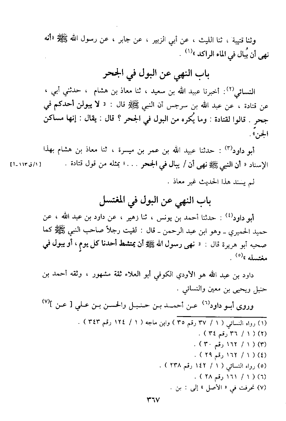 وثنا قُتَيْبَة، ثَنَا اللَّيْث، عَن ابي الزبير، عَن جَابر، عَن رَسُول الله - صَلَّى اللَّهُ عَلَيْهِ وَسَلَّم َ - " أَنه نهى أَن يبال فِي المَاء الراكد ".