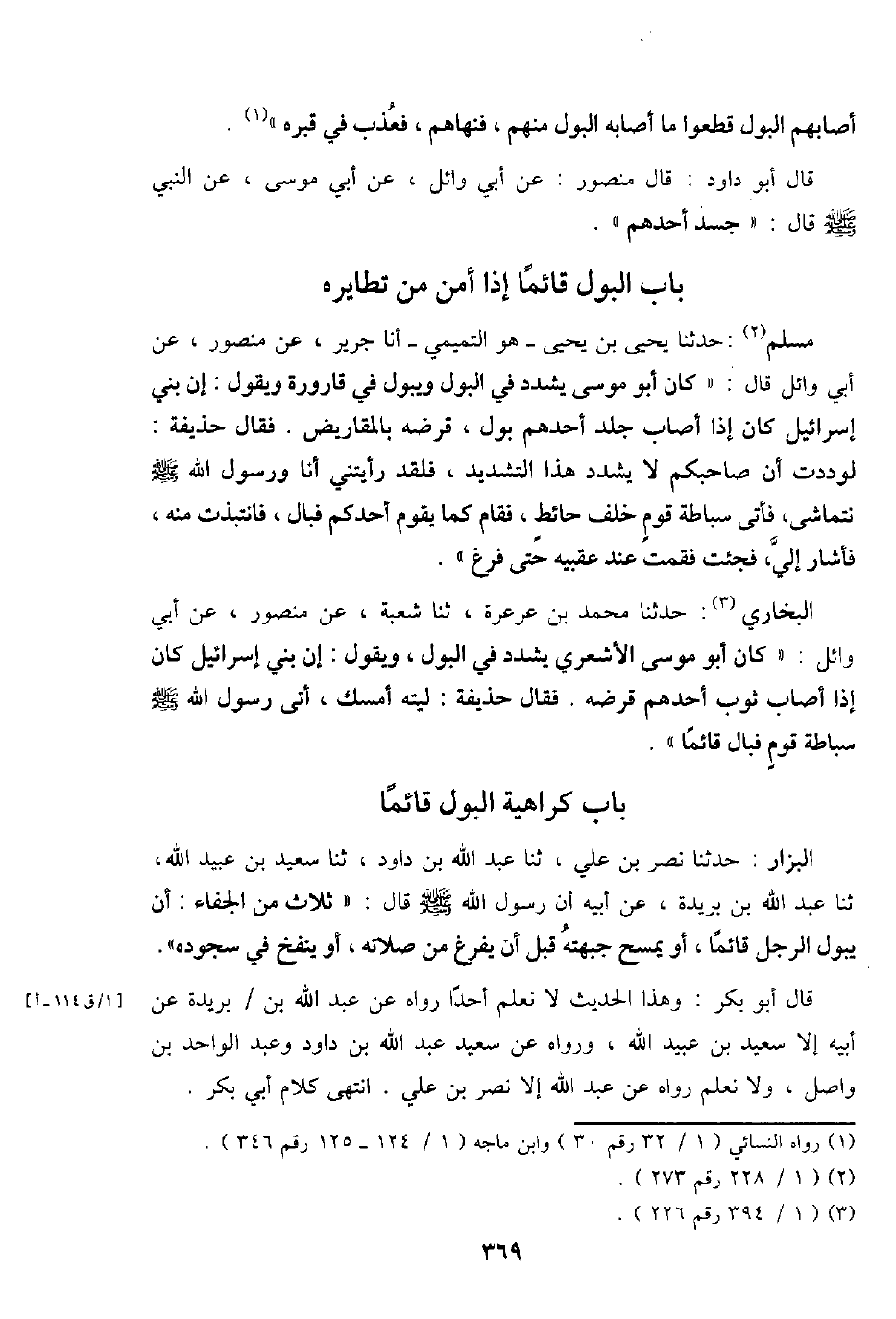 الْبَزَّار: حَدثنَا نصر بن عَليّ، ثَنَا عبد الله بن دَاوُد، ثَنَا سعيد بن عبيد الله، ثَنَا عبد الله بن بُرَيْدَة، عَن أَبِيه أَن رَسُول الله - صَلَّى اللَّهُ عَلَيْهِ وَسَلَّم َ - قَالَ: " ثَلَاث من الْجفَاء: أَن يَبُول الرجل قَائِما، أَو يمسح جَبهته قبل أَن يفرغ من صلَاته، أَو ينْفخ فِي سُجُوده ".