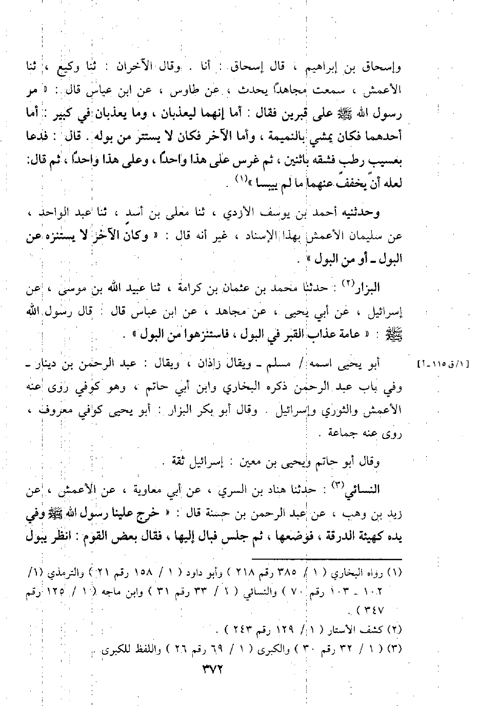 الْبَزَّار: حَدثنَا مُحَمَّد بن عُثْمَان بن كَرَامَة، ثَنَا عبيد الله بن مُوسَى، عَن إِسْرَائِيل، عَن ابي يحيى، عَن مُجَاهِد، عَن ابْن عَبَّاس قَالَ: قَالَ رَسُول الله - صَلَّى اللَّهُ عَلَيْهِ وَسَلَّم َ -: " عَامَّة عَذَاب الْقَبْر فِي الْبَوْل، فاستنزهوا من الْبَوْل ".