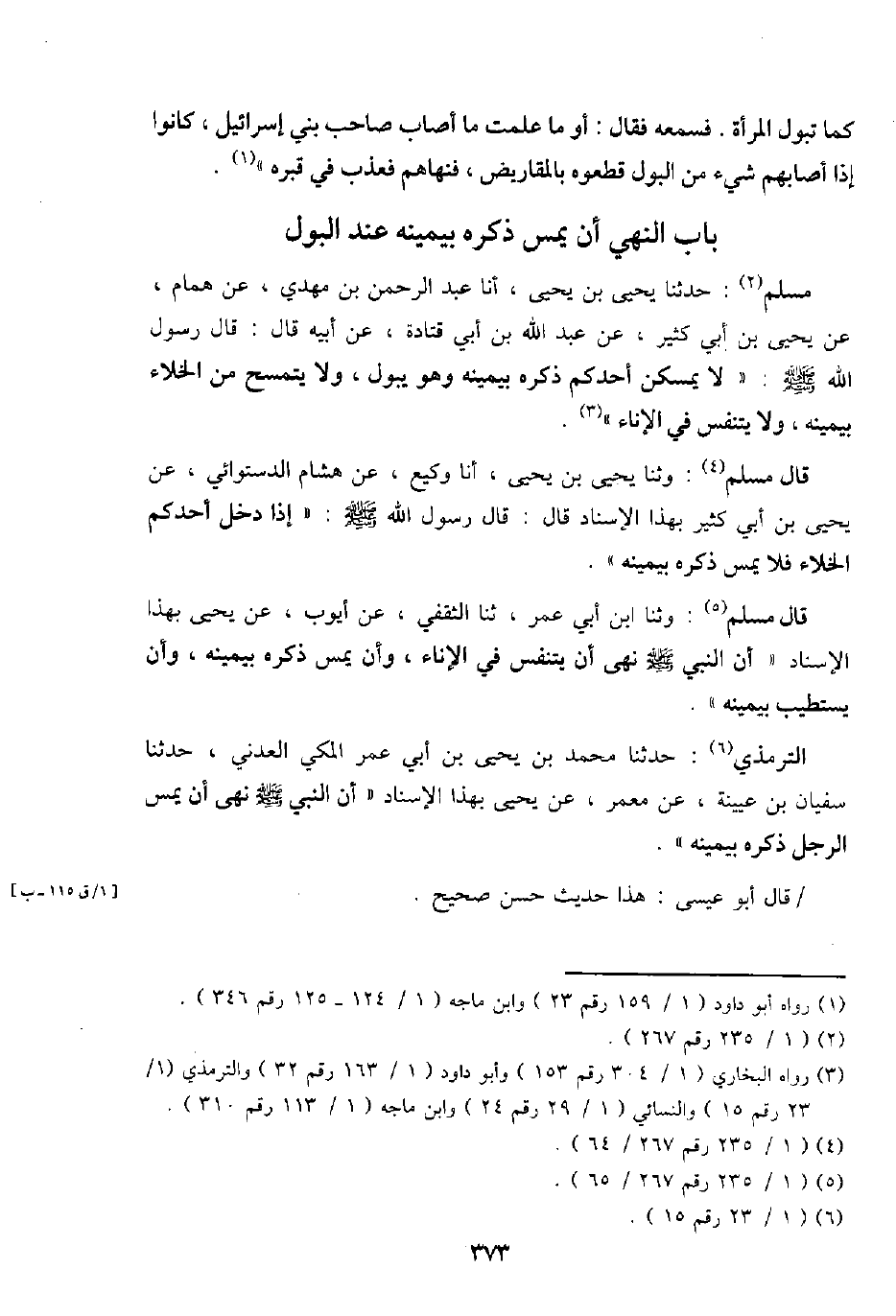 مُسلم: حَدثنَا يحيى بن يحيى، أَنا عبد الرَّحْمَن بن مهْدي، عَن همام، عَن يحيى بن أبي كثير، عَن عبد الله بن أبي قَتَادَة، عَن أَبِيه قَالَ: قَالَ رَسُول الله - صَلَّى اللَّهُ عَلَيْهِ وَسَلَّم َ -: " لَا يمسكن أحدكُم ذكره بِيَمِينِهِ وَهُوَ يَبُول، وَلَا يتمسح من الْخَلَاء بِيَمِينِهِ، وَلَا يتنفس فِي الْإِنَاء ".