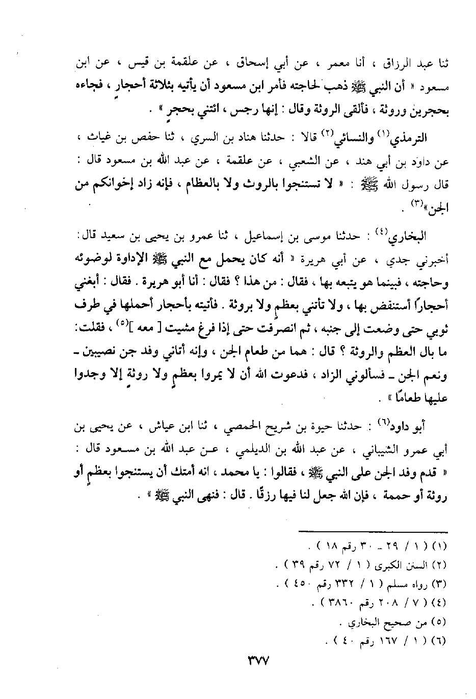التِّرْمِذِيّ وَالنَّسَائِيّ قَالَا: حَدثنَا هناد بن السّري، ثَنَا حَفْص بن غياث، عَن دَاوُد بن أبي هِنْد، عَن الشّعبِيّ، عَن عَلْقَمَة، عَن عبد الله بن مَسْعُود قَالَ: قَالَ رَسُول الله - صَلَّى اللَّهُ عَلَيْهِ وَسَلَّم َ -: " لَا تستنجوا بالروث وَلَا بالعظام، فَإِنَّهُ زَاد إخْوَانكُمْ من الْجِنّ ".
