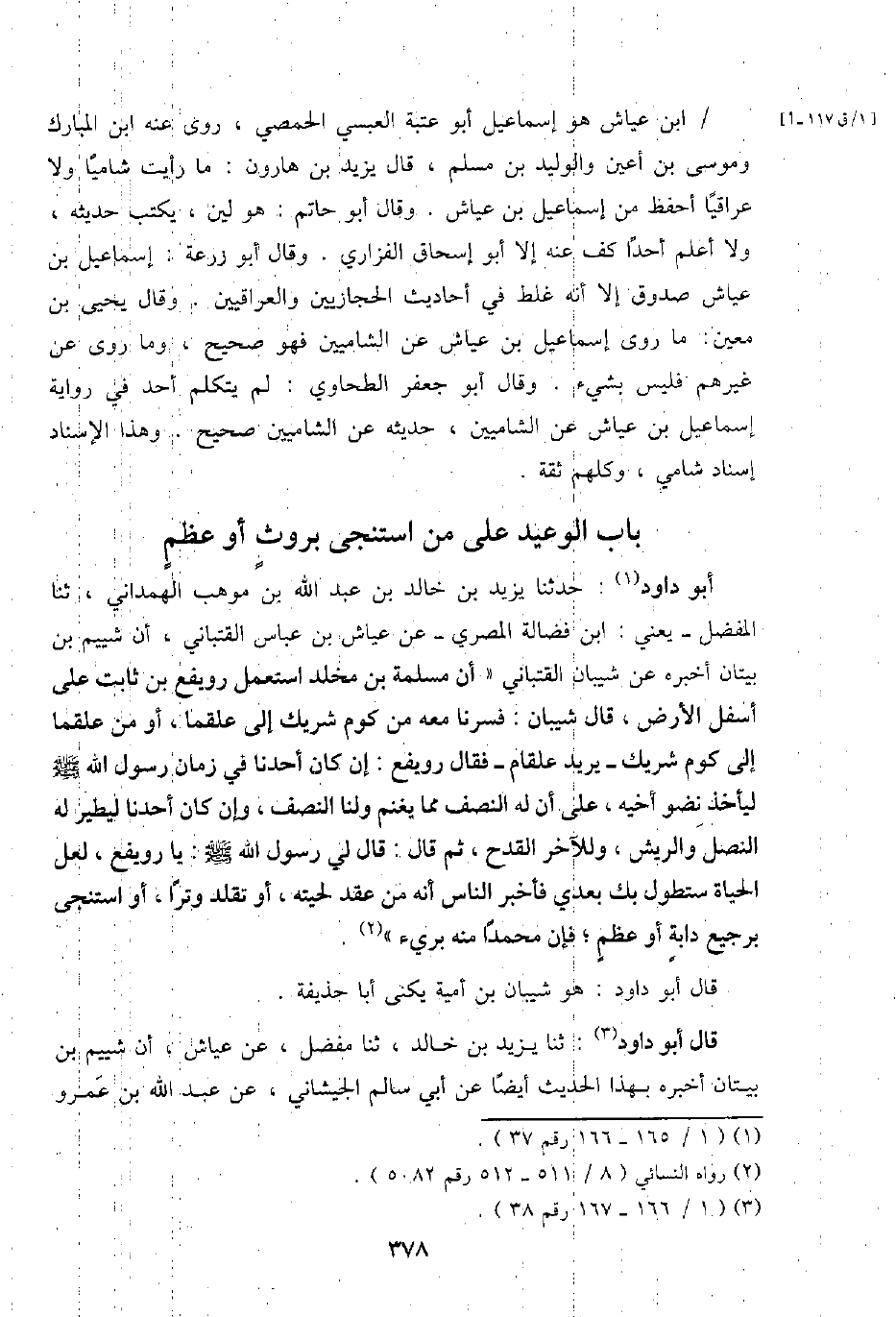 أَبُو دَاوُد: حَدثنَا يزِيد بن خَالِد بن عبد الله بن موهب الْهَمدَانِي، ثَنَا الْمفضل - يَعْنِي: ابْن فضَالة الْمصْرِيّ - عَن عَيَّاش بن عَبَّاس الْقِتْبَانِي، أَن شييم بن بيتان أخبرهُ عَن شَيبَان الْقِتْبَانِي " أَن مسلمة بن مخلد اسْتعْمل رويفع بن ثَابت على أَسْفَل الأَرْض، قَالَ شَيبَان: فسرنا مَعَه من كوم شريك إِلَى علقما، أَو من علقما إِلَى كوم شريك - يُرِيد علقام - فَقَالَ رويفع: إِن كَانَ أَحَدنَا فِي زمَان رَسُول الله - صَلَّى اللَّهُ عَلَيْهِ وَسَلَّم َ - ليَأْخُذ نضو أَخِيه، على أَن لَهُ النّصْف مِمَّا يغنم وَلنَا النّصْف، وَإِن كَانَ أَحَدنَا ليطير لَهُ النصل والريش، وَللْآخر الْقدح، ثمَّ قَالَ: قَالَ لي رَسُول الله - صَلَّى اللَّهُ عَلَيْهِ وَسَلَّم َ -: يَا رويفع، لَعَلَّ الْحَيَاة ستطول بك بعدِي فَأخْبر النَّاس أَنه من عقد لحيته، أَو تقلد وترا، أَو استنجى برجيع دَابَّة أَو عظم، فَإِن مُحَمَّدًا مِنْهُ بَرِيء ". قَالَ أَبُو دَاوُد: هُوَ شَيبَان بن أُميَّة يكنى أَبَا حذيفه.