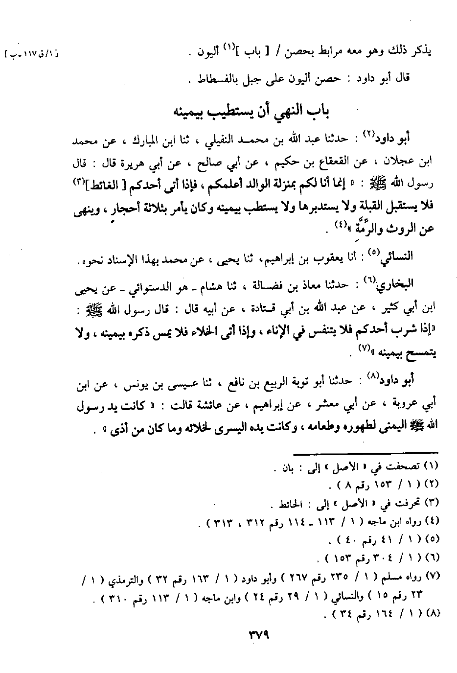 أَبُو دَاوُد: حَدثنَا أَبُو تَوْبَة الرّبيع بن نَافِع، ثَنَا عِيسَى بن يُونُس، عَن ابْن أبي عرُوبَة، عَن أبي معشر، عَن إِبْرَاهِيم، عَن عَائِشَة قَالَت: " كَانَت يَد رَسُول الله - صَلَّى اللَّهُ عَلَيْهِ وَسَلَّم َ - الْيُمْنَى لطهوره وَطَعَامه، وَكَانَت يَده الْيُسْرَى لخلائه وَمَا كَانَ من أَذَى ".