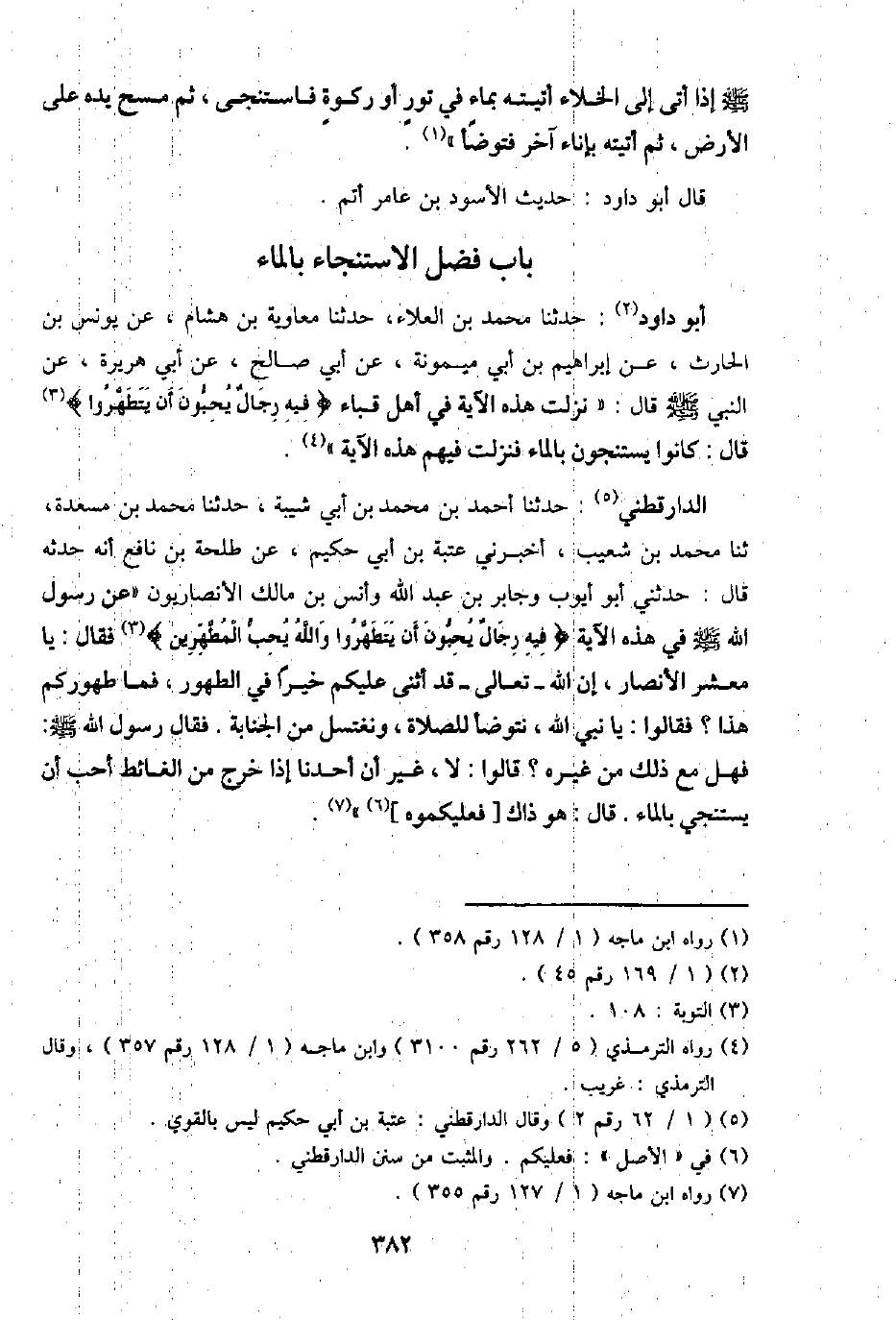 الدَّارَقُطْنِيّ: حَدثنَا أَحْمد بن مُحَمَّد بن أبي شيبَة، حَدثنَا مُحَمَّد بن مسْعدَة، ثَنَا مُحَمَّد بن شُعَيْب، أَخْبرنِي عتبَة بن أبي حَكِيم، عَن طَلْحَة بن نَافِع أَنه حَدثهُ قَالَ: حَدثنِي أَبُو أَيُّوب وَجَابِر بن عبد الله وَأنس بن مَالك الْأَنْصَارِيُّونَ " عَن رَسُول الله - صَلَّى اللَّهُ عَلَيْهِ وَسَلَّم َ - فِي هَذِه الْآيَة {فِيهِ رجال يحبونَ أَن يَتَطَهَّرُوا وَالله يحب المطهرين} فَقَالَ: يَا معشر الْأَنْصَار، إِن الله 0 تَعَالَى - قد أثنى عَلَيْكُم خيرا فِي الطّهُور، فَمَا طهوركم هَذَا؟ فَقَالُوا: يَا نَبِي الله، نَتَوَضَّأ للصَّلَاة، ونغتسل من الْجَنَابَة، فَقَالَ رَسُول الله - صَلَّى اللَّهُ عَلَيْهِ وَسَلَّم َ -: فَهَل مَعَ ذَلِك من غَيره؟ قَالُوا: لَا، غير أَن أَحَدنَا إِذا خرج من الْغَائِط أحب أَن يستنجي بِالْمَاءِ. قَالَ: هُوَ ذَاك [فعليكموه] ".