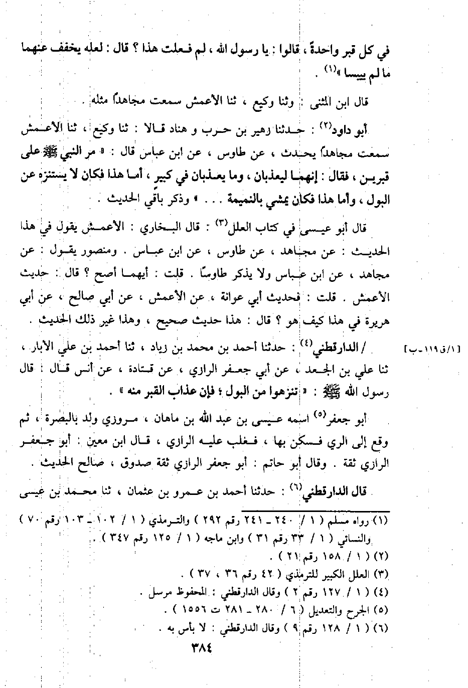 الدَّارَقُطْنِيّ: حَدثنَا أَحْمد بن مُحَمَّد بن زِيَاد، ثَنَا أَحْمد بن عَليّ الْأَبَّار، ثَنَا عَليّ بن الْجَعْد، عَن أبي جَعْفَر الرَّازِيّ، عَن قَتَادَة، عَن أنس قَالَ: قَالَ رَسُول الله - صَلَّى اللَّهُ عَلَيْهِ وَسَلَّم َ -: " تنزهوا من الْبَوْل، فَإِن عَذَاب الْقَبْر مِنْهُ ".