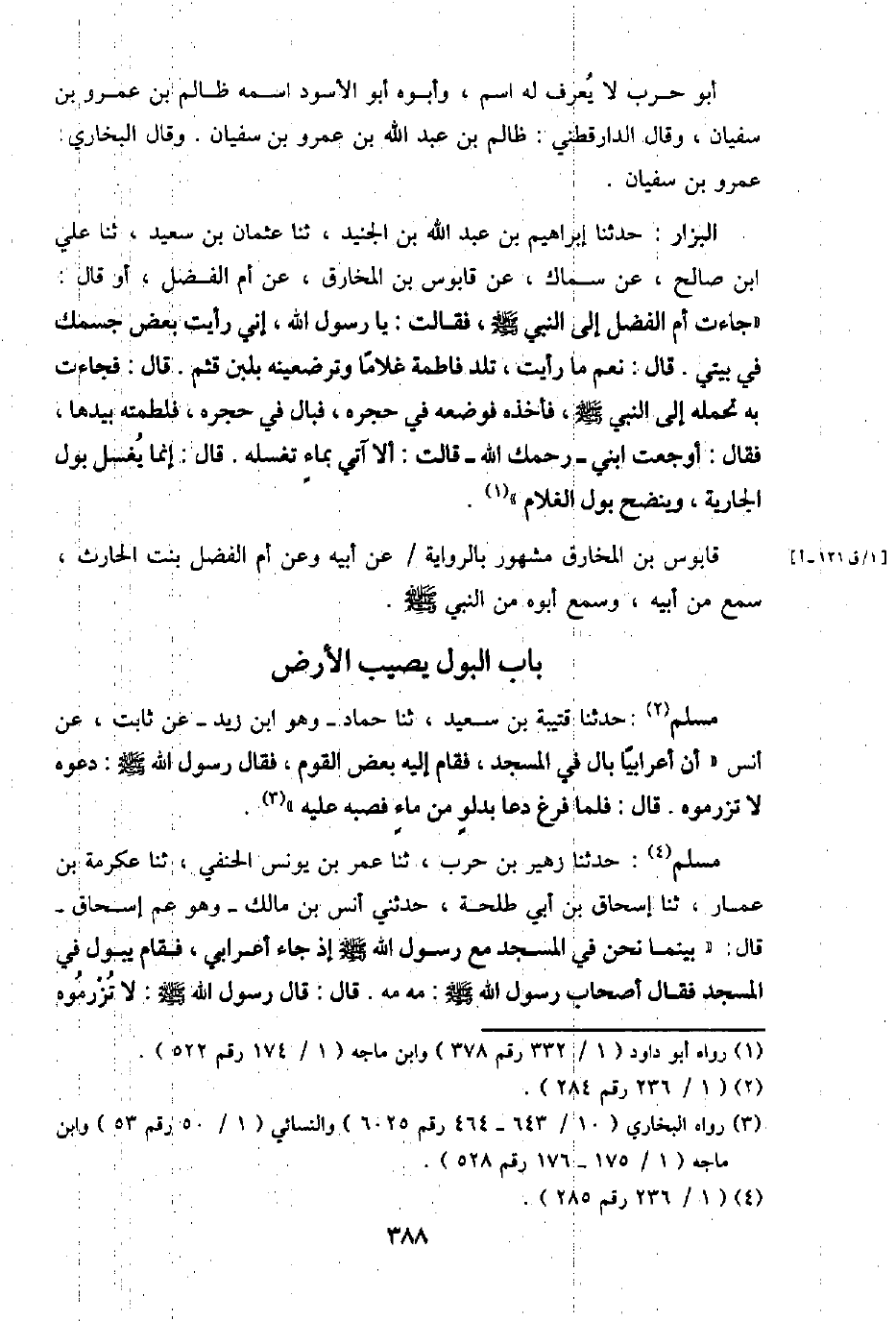 مُسلم: حَدثنَا قُتَيْبَة بن سعيد، ثَنَا حَمَّاد - وَهُوَ ابْن زيد - عَن ثَابت، عَن أنس " أَن أَعْرَابِيًا بَال فِي الْمَسْجِد، فَقَامَ إِلَيْهِ بعض الْقَوْم، فَقَالَ رَسُول الله - صَلَّى اللَّهُ عَلَيْهِ وَسَلَّم َ -: دَعوه لَا تزرموه. قَالَ: فَلَمَّا فرغ دَعَا بِدَلْو من مَاء فَصَبَّهُ عَلَيْهِ ".