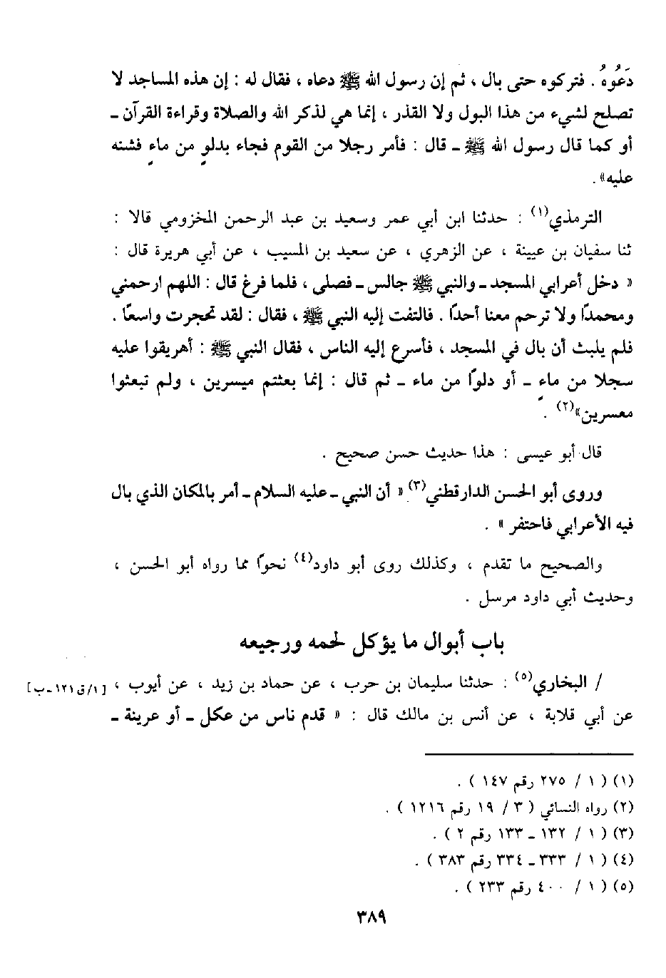 التِّرْمِذِيّ: حَدثنَا ابْن أبي عمر وَسَعِيد بن عبد الرَّحْمَن المَخْزُومِي قَالَا: ثَنَا سُفْيَان بن عُيَيْنَة، عَن الزُّهْرِيّ، عَن سعيد بن الْمسيب، عَن أبي هُرَيْرَة قَالَ: " دخل أَعْرَابِي الْمَسْجِد - وَالنَّبِيّ - صَلَّى اللَّهُ عَلَيْهِ وَسَلَّم َ - جَالس - فصلى، فَلَمَّا فرغ قَالَ: اللَّهُمَّ ارْحَمْنِي ومحمداً وَلَا ترحم مَعنا أحدا. فَالْتَفت إِلَيْهِ النَّبِي - صَلَّى اللَّهُ عَلَيْهِ وَسَلَّم َ -، فَقَالَ: لقد تحجرت وَاسِعًا. فَلم يلبث أَن بَال فِي الْمَسْجِد، فأسرع إِلَيْهِ النَّاس، فَقَالَ النَّبِي - صَلَّى اللَّهُ عَلَيْهِ وَسَلَّم َ -: اهريقوا عَلَيْهِ سجلا من مَاء - أَو دلواً من مَاء - ثمَّ قَالَ: إِنَّمَا بعثتم ميسرين، وَلم تبعثوا معسرين ".