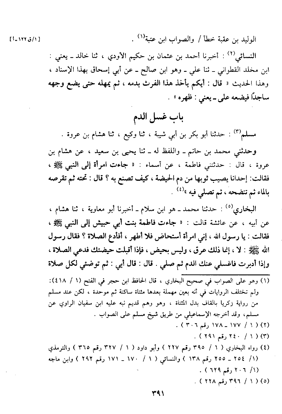 البُخَارِيّ: حَدثنَا مُحَمَّد - هُوَ ابْن سَلام - أخبرنَا أَبُو مُعَاوِيَة، ثَنَا هِشَام، عَن ابيه، عَن عَائِشَة قَالَت: " جَاءَت فَاطِمَة بنت أبي حُبَيْش إِلَى النَّبِي - صَلَّى اللَّهُ عَلَيْهِ وَسَلَّم َ -، فَقَالَت: يَا رَسُول الله، إِنِّي امْرَأَة أسْتَحَاض فَلَا أطهر، أفأدع الصَّلَاة؟ فَقَالَ رَسُول الله - صَلَّى اللَّهُ عَلَيْهِ وَسَلَّم َ -: لَا، إِنَّمَا ذَلِك عرق، وَلَيْسَ بحيض، فَإِذا أَقبلت حيضتك فدعي الصَّلَاة، وَإِذا أَدْبَرت فاغسلي عَنْك الدَّم ثمَّ صلي. قَالَ: قَالَ أبي: ثمَّ توضئي لكل صَلَاة