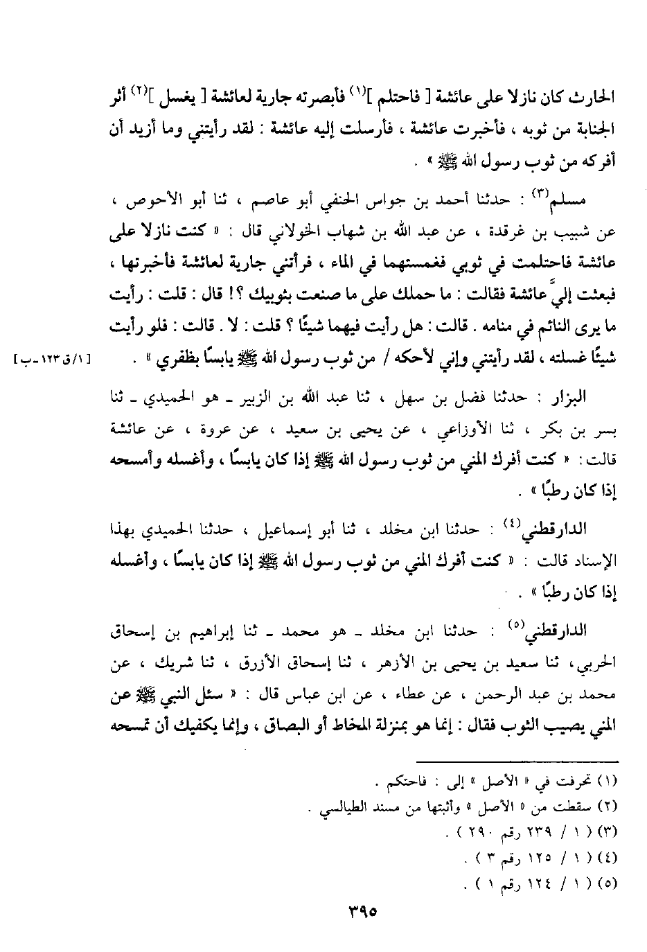 الدَّارَقُطْنِيّ: حَدثنَا ابْن مخلد، ثَنَا أَبُو إِسْمَاعِيل، حَدثنَا الْحميدِي بِهَذَا الْإِسْنَاد قَالَت: " كنت أفرك الْمَنِيّ من ثوب رَسُول الله - صَلَّى اللَّهُ عَلَيْهِ وَسَلَّم َ - إِذا كَانَ يَابسا، وأغسله إِذا كَانَ رطبا ".
