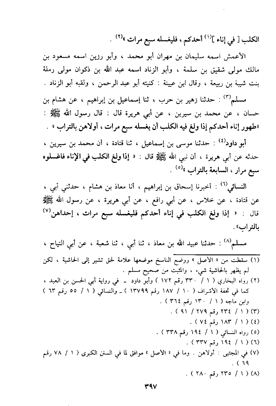 مُسلم: حَدثنَا زُهَيْر بن حَرْب، ثَنَا إِسْمَاعِيل بن إِبْرَاهِيم، عَن هِشَام بن حسان، عَن مُحَمَّد بن سِيرِين، عَن أبي هُرَيْرَة قَالَ: قَالَ رَسُول الله - صَلَّى اللَّهُ عَلَيْهِ وَسَلَّم َ -: " طهُور إِنَاء أحدكُم إِذا ولغَ فِيهِ الْكَلْب أَن يغسلهُ سبع مَرَّات، أولَاهُنَّ بِالتُّرَابِ ".