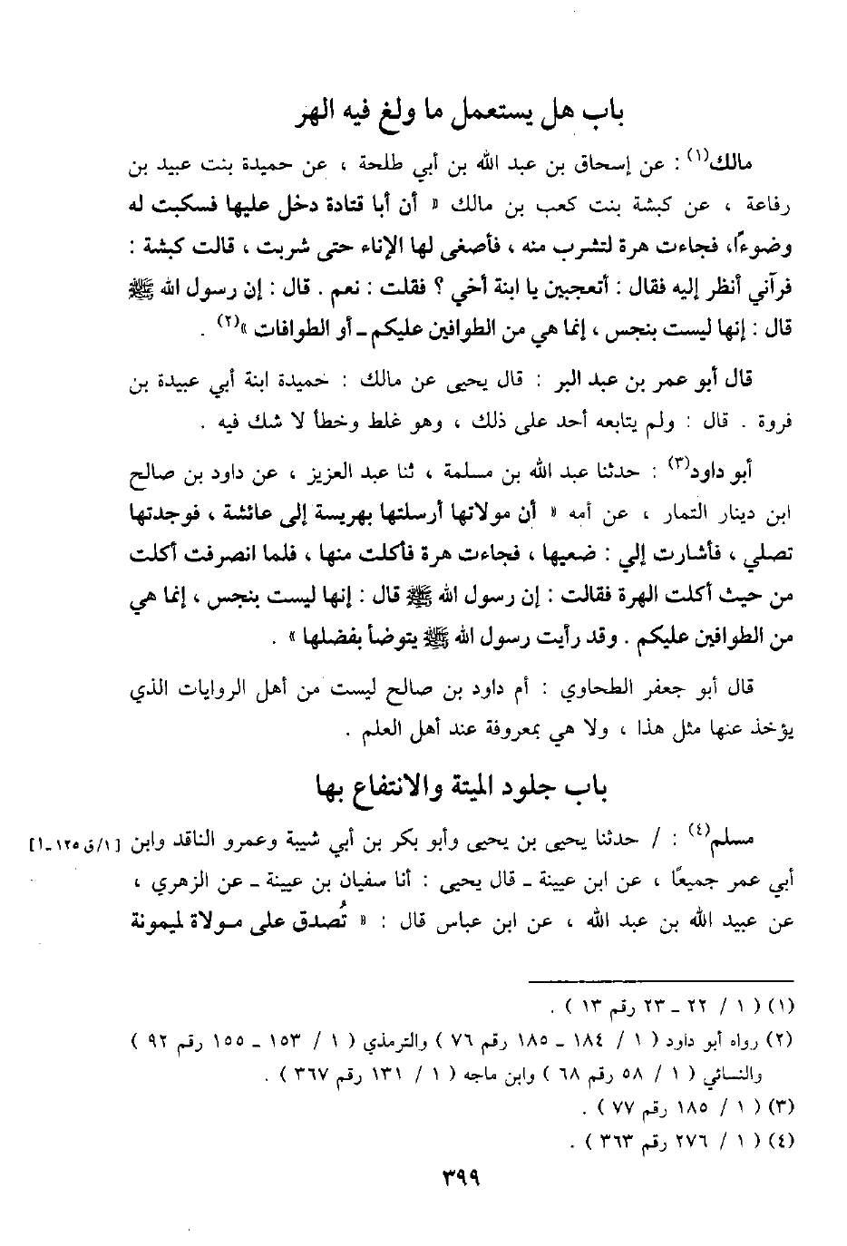 مَالك: عَن إِسْحَاق بن عبد الله بن أبي طَلْحَة، عَن حميدة بنت عبيد بن رِفَاعَة، عَن كَبْشَة بنت كَعْب بن مَالك " أَن أَبَا قَتَادَة دخل عَلَيْهَا فَسَكَبت لَهُ وضُوءًا، فَجَاءَت هرة لتشرب مِنْهُ، فأصغى لَهَا الْإِنَاء حَتَّى شربت، قَالَت كَبْشَة: فرآني أنظر إِلَيْهِ فَقَالَ: أَتَعْجَبِينَ يَا ابْنة أخي؟ فَقلت: نعم. قَالَ: إِن رَسُول الله - صَلَّى اللَّهُ عَلَيْهِ وَسَلَّم َ - قَالَ: إِنَّهَا لَيست بِنَجس، إِنَّمَا هِيَ من الطوافين عَلَيْكُم - أَو الطوافات ".