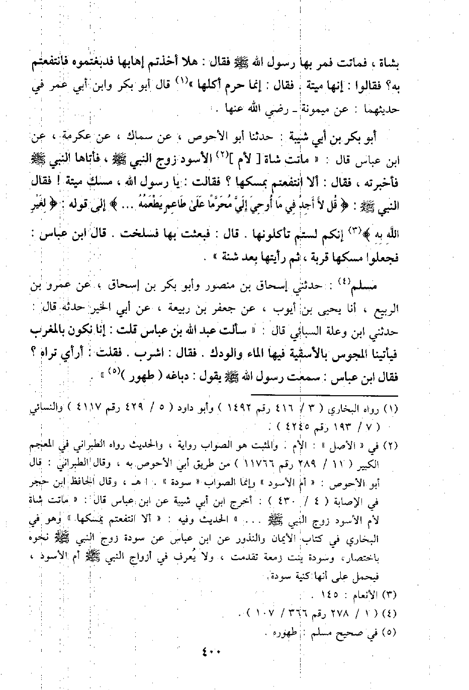 أَبُو بكر بن أبي شيبَة: حَدثنَا أَبُو الْأَحْوَص، عَن سماك، عَن عِكْرِمَة، عَن ابْن عَبَّاس قَالَ: " مَاتَت شَاة [لأم] الْأسود زوج النَّبِي - صَلَّى اللَّهُ عَلَيْهِ وَسَلَّم َ -، فَأَتَاهُ النَّبِي - صَلَّى اللَّهُ عَلَيْهِ وَسَلَّم َ - فَأَخْبَرته، فَقَالَ: أَلا انتفعتم بمسكها. فَقَالَت: يَا رَسُول الله، مسك ميتَة! فَقَالَ النَّبِي - صَلَّى اللَّهُ عَلَيْهِ وَسَلَّم َ -: {قل لَا أجد فِي مَا أُوحِي إِلَيّ محرما على طاعم يطعمهُ ... " إِلَى قَوْله: {لغير الله بِهِ} إِنَّكُم لَسْتُم تأكلونها قَالَ: فَبعثت بهَا فسلخت. قَالَ ابْن عَبَّاس: فَجعلُوا مسكها قربَة، ثمَّ رَأَيْتهَا بعد شنة ".