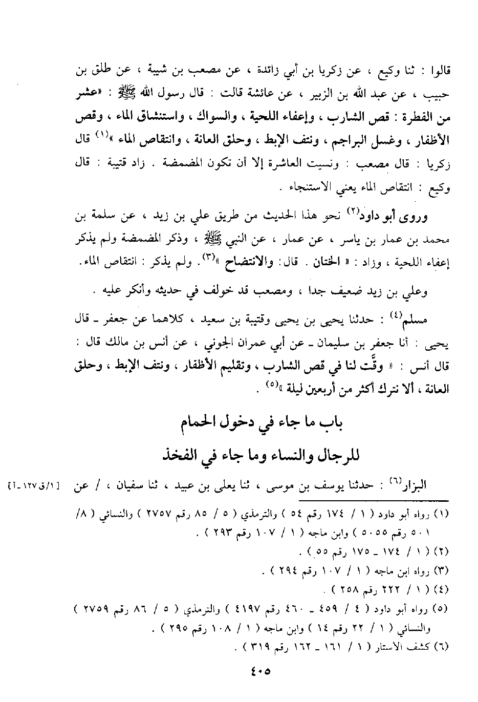 قَالُوا: ثَنَا وَكِيع، عَن زَكَرِيَّا بن أبي زَائِدَة، عَن مُصعب بن شيبَة، عَن طلق بن حبيب، عَن عبد الله بن الزبير، عَن عَائِشَة قَالَت: قَالَ رَسُول الله - صَلَّى اللَّهُ عَلَيْهِ وَسَلَّم َ -: " عشر من الْفطْرَة: قصّ الشَّارِب، وإعفاء اللِّحْيَة، والسواك، واستنشاق المَاء، وقص الْأَظْفَار، وَغسل البراجم، ونتف الْإِبِط، وَحلق الْعَانَة، وانتقاص المَاء " قَالَ زَكَرِيَّا: قَالَ مُصعب: ونسيت الْعَاشِرَة إِلَّا أَن تكون الْمَضْمَضَة. زَاد قُتَيْبَة: قَالَ وَكِيع: انتقاص المَاء يَعْنِي الِاسْتِنْجَاء.