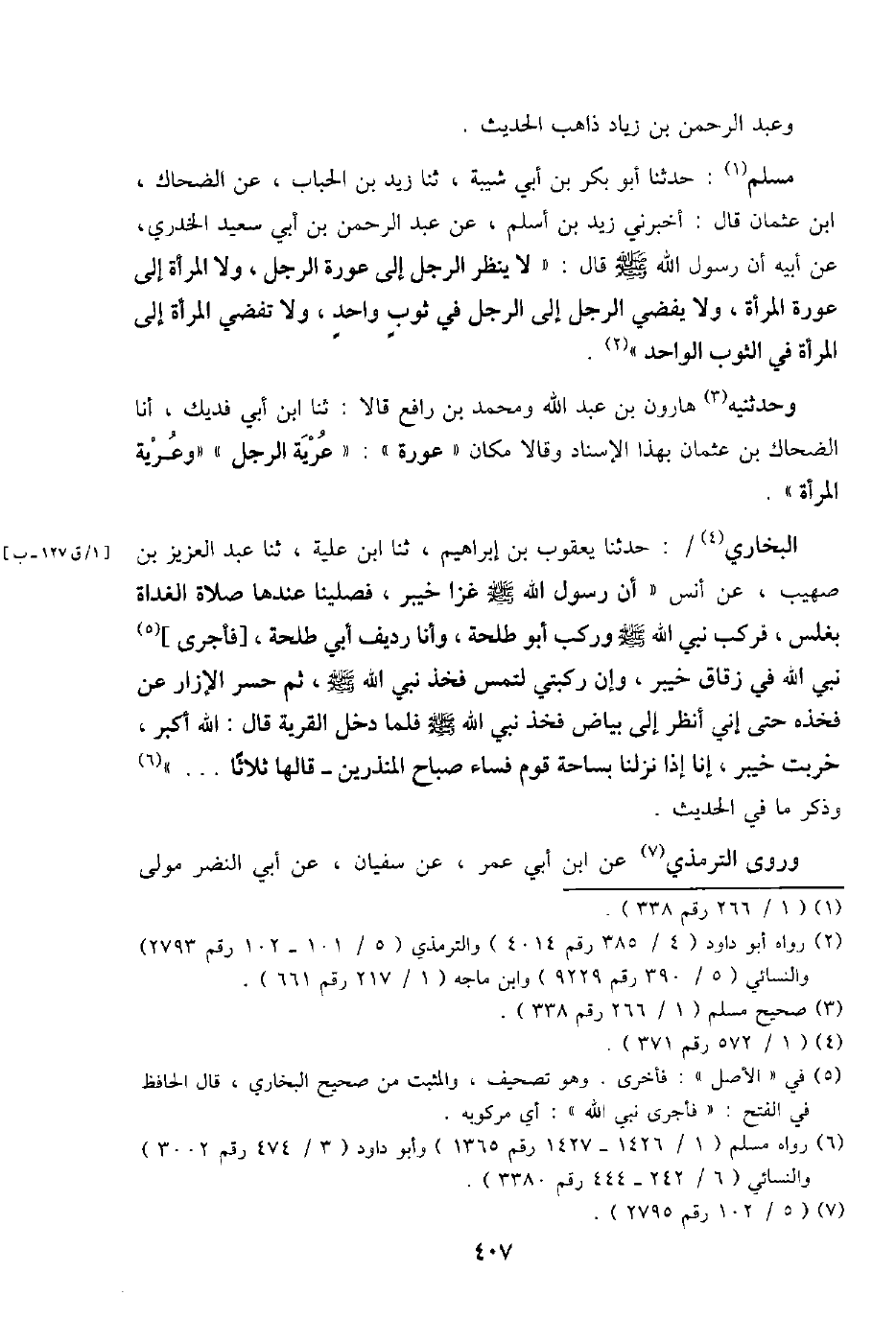 مُسلم: حَدثنَا أَبُو بكر بن أبي شيبَة، ثَنَا زيد بن الْحباب، عَن الضَّحَّاك، ابْن عُثْمَان قَالَ: أَخْبرنِي زيد بن اسْلَمْ، عَن عبد الرَّحْمَن بن أبي سعيد الْخُدْرِيّ، عَن أَبِيه أَن رَسُول الله - صَلَّى اللَّهُ عَلَيْهِ وَسَلَّم َ - قَالَ: " لَا ينظر الرجل إِلَى عَورَة الرجل، وَلَا الْمَرْأَة إِلَى عَورَة الْمَرْأَة، وَلَا يُفْضِي الرجل إِلَى الرجل فِي ثوب وَاحِد، وَلَا تُفْضِي الْمَرْأَة إِلَى الْمَرْأَة فِي الثَّوْب الْوَاحِد ".