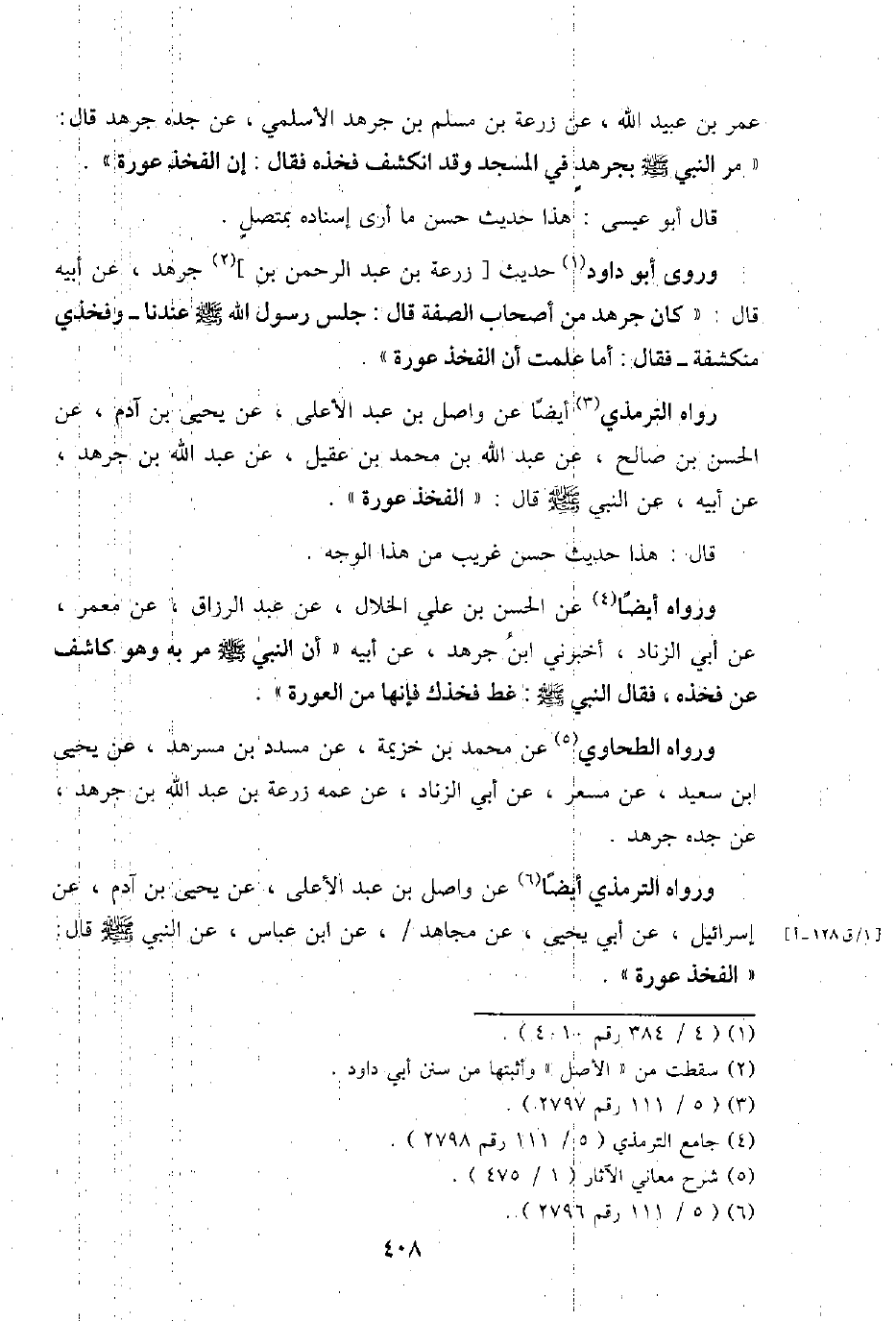 عمر بن عبيد الله، عَن زرْعَة بن مُسلم بن جرهد الْأَسْلَمِيّ، عَن جده جرهد قَالَ: " مر النَّبِي - صَلَّى اللَّهُ عَلَيْهِ وَسَلَّم َ - بجرهد فِي الْمَسْجِد وَقد انْكَشَفَ فَخذه فَقَالَ: إِن الْفَخْذ عَورَة ".