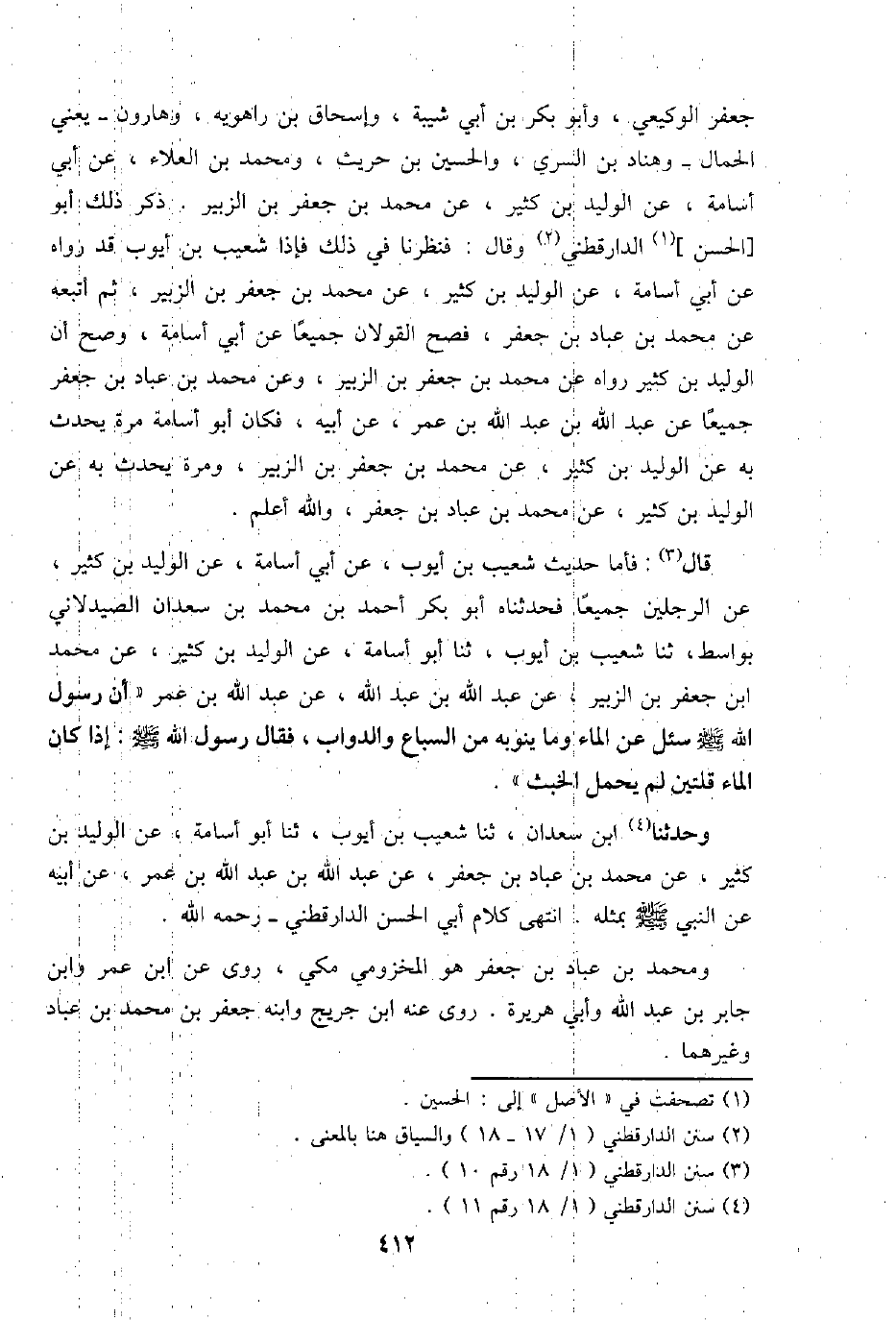 جَعْفَر الوكيعي، وَأَبُو بكر بن أبي شيبَة، وَإِسْحَاق بن رَاهْوَيْةِ، وَهَارُون - يَعْنِي الْحمال - وهناد بن السّري، وَالْحُسَيْن بن حُرَيْث، وَمُحَمّد بن الْعَلَاء، عَن أبي أُسَامَة، عَن الْوَلِيد بن كثير، عَن مُحَمَّد بن جَعْفَر بن الزبير. ذكر ذَلِك أَبُو [الْحسن] الدَّارَقُطْنِيّ وَقَالَ: فَنَظَرْنَا فِي ذَلِك فَإِذا شُعَيْب بن أَيُّوب قد رَوَاهُ عَن أبي اسامة، عَن الْوَلِيد بن كثير، عَن مُحَمَّد بن جَعْفَر بن الزبير، ثمَّ أتبعه عَن مُحَمَّد بن عباد بن جَعْفَر، فصح الْقَوْلَانِ جَمِيعًا عَن أبي أُسَامَة، وَصَحَّ أَن الْوَلِيد بن كثير رَوَاهُ عَن مُحَمَّد بن جَعْفَر بن الزبير، وَعَن مُحَمَّد بن عباد بن جَعْفَر جَمِيعًا عَن عبد الله بن عبد الله بن عمر، عَن أَبِيه، فَكَانَ أَبُو أُسَامَة مرّة يحدث بِهِ عَن الْوَلِيد بن كثير، عَن مُحَمَّد بن جَعْفَر بن الزبير، وَمرَّة يحدث بِهِ عَن الْوَلِيد بن كثير، عَن مُحَمَّد بن عباد بن جَعْفَر، وَالله أعلم.