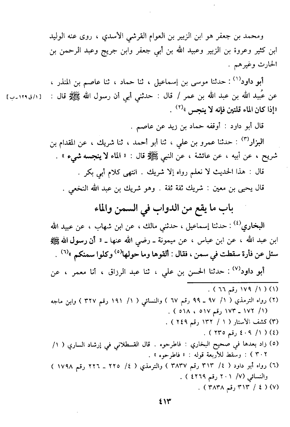 أَبُو دَاوُد: حَدثنَا مُوسَى بن إِسْمَاعِيل، ثَنَا حَمَّاد، ثَنَا عَاصِم بن الْمُنْذر، عَن عبيد الله بن عبد الله بن عمر / قَالَ: حَدثنِي أبي أَن رَسُول الله - صَلَّى اللَّهُ عَلَيْهِ وَسَلَّم َ - قَالَ " إِذا كَانَ المَاء قُلَّتَيْنِ فَإِنَّهُ لَا ينجس ".