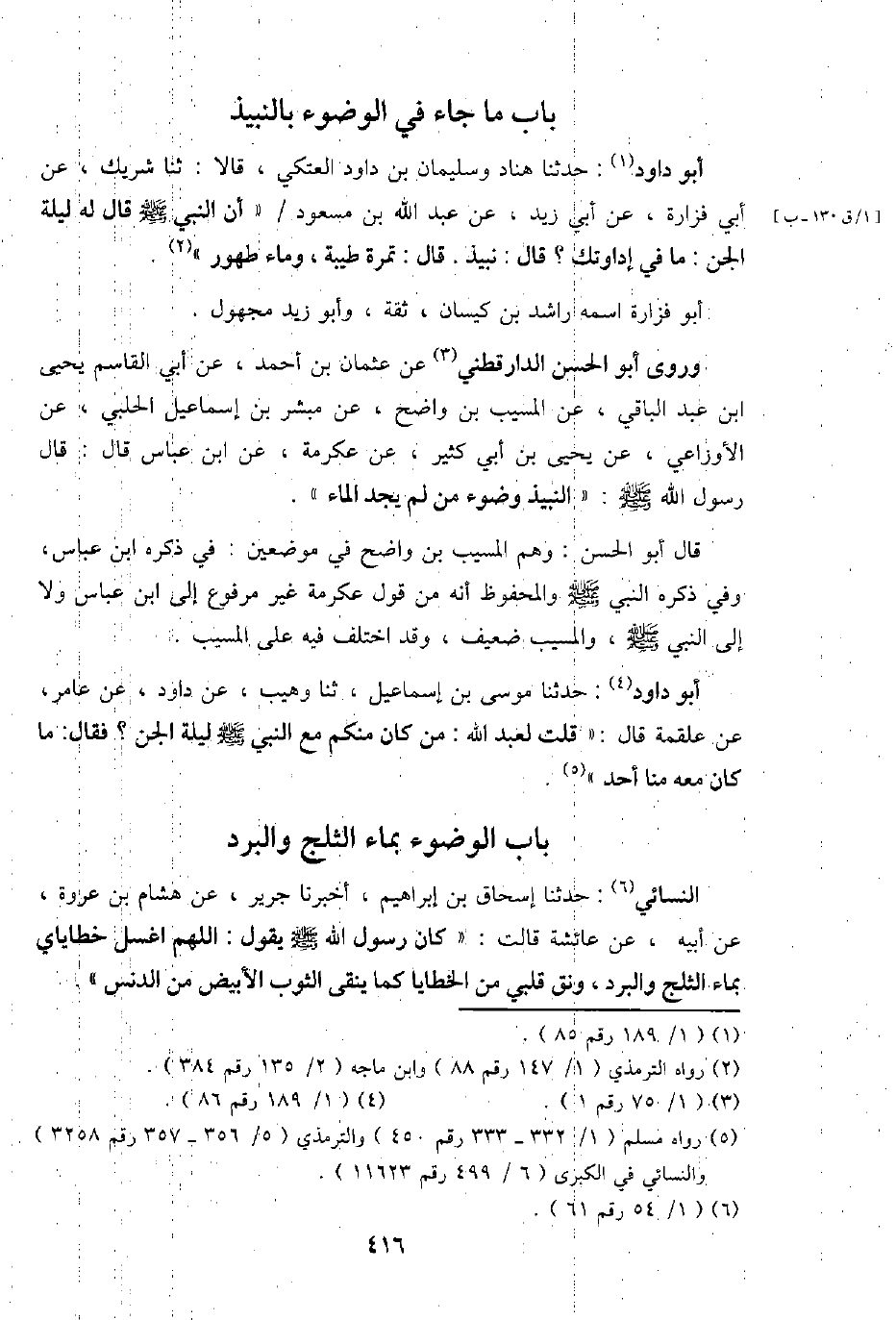 أَبُو دَاوُد: حَدثنَا هناد وَسليمَان بن دَاوُد الْعَتكِي، قَالَا: ثَنَا شريك، عَن أبي فَزَارَة، عَن أبي زيد، عَن عبد الله بن مَسْعُود " / أَن النَّبِي - صَلَّى اللَّهُ عَلَيْهِ وَسَلَّم َ - قَالَ لَهُ لَيْلَة الْجِنّ: مَا فِي إداوتك؟ قَالَ: نَبِيذ. قَالَ: تَمْرَة طيبَة، وَمَاء طهُور ". أَبُو فَزَارَة اسْمه رَاشد بن كيسَان، ثِقَة، وَأَبُو زيد مَجْهُول