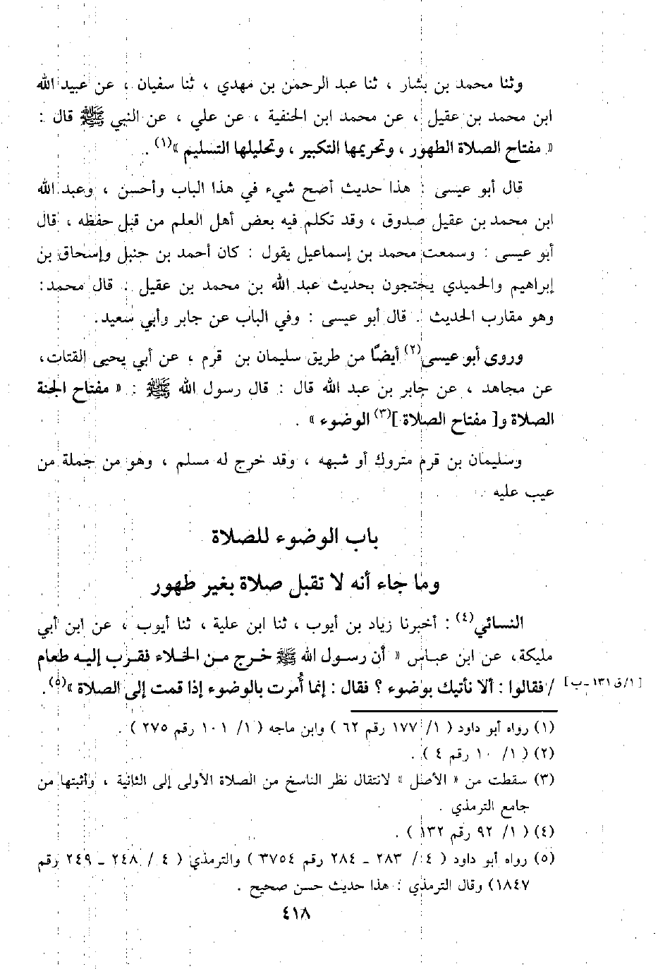 وثنا مُحَمَّد بن بشار، ثَنَا عبد الرَّحْمَن بن مهْدي، ثَنَا سُفْيَان، عَن عبيد الله ابْن مُحَمَّد بن عقيل، عَن مُحَمَّد ابْن الْحَنَفِيَّة، عَن عَليّ، عَن النَّبِي - صَلَّى اللَّهُ عَلَيْهِ وَسَلَّم َ - قَالَ: " مِفْتَاح الصَّلَاة الطّهُور، وتحريمها التَّكْبِير، وتحليلها التَّسْلِيم ".