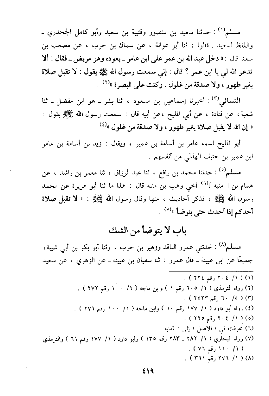 مُسلم: حَدثنَا سعيد بن مَنْصُور وقتيبة بن سعيد وَأَبُو كَامِل الجحدري - وَاللَّفْظ لسَعِيد - قَالُوا: ثَنَا أَبُو عوَانَة، عَن سماك بن حَرْب، عَن مُصعب بن سعد قَالَ: " دخل عبد الله بن عمر على ابْن عَامر - يعودهُ وَهُوَ مَرِيض - فَقَالَ: أَلا تَدْعُو الله لي يَا ابْن عمر؟ قَالَ: إِنِّي سَمِعت رَسُول الله - صَلَّى اللَّهُ عَلَيْهِ وَسَلَّم َ - يَقُول: لَا تقبل صَلَاة بِغَيْر طهُور، وَلَا صَدَقَة من غلُول. وَكنت على الْبَصْرَة ".