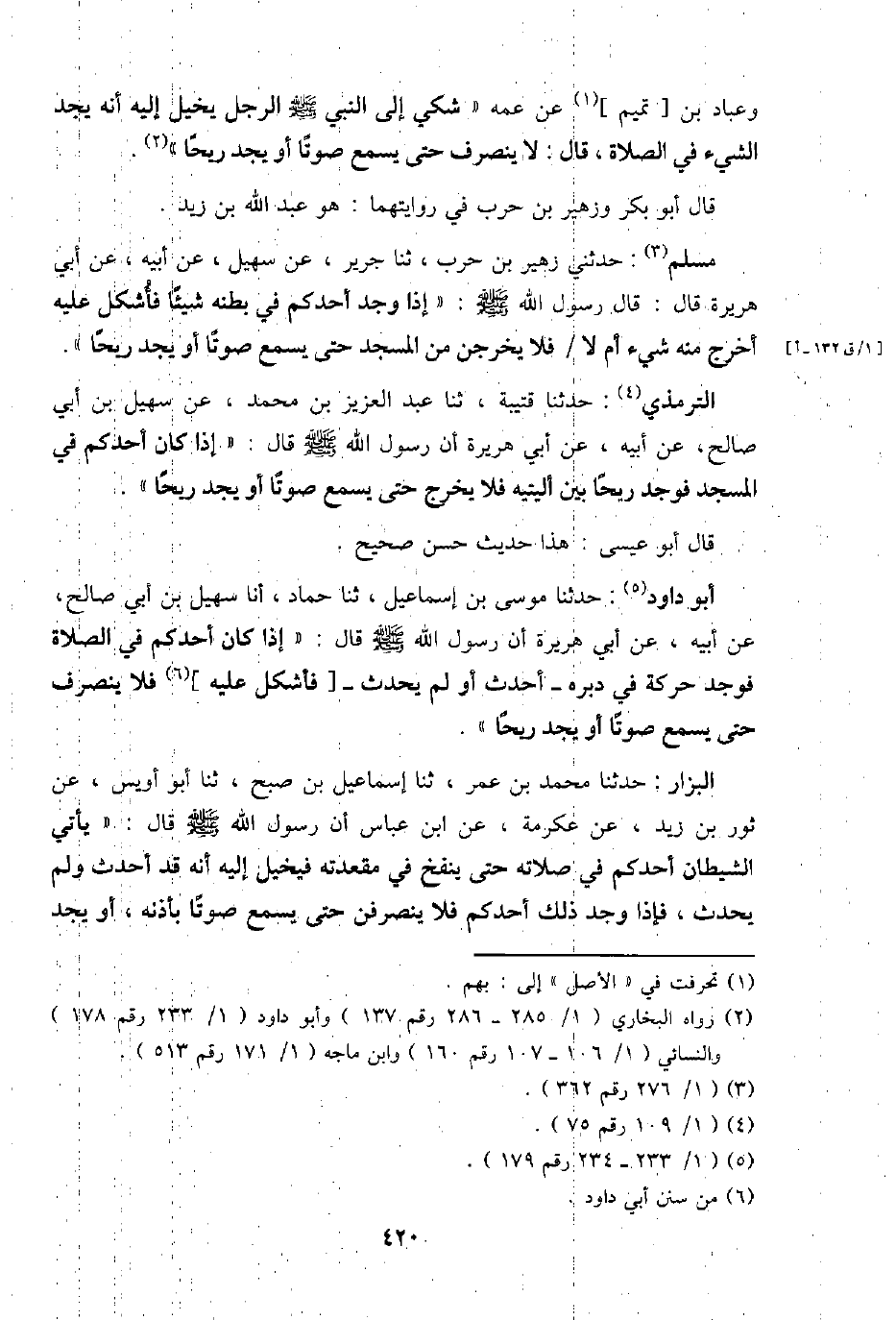 مُسلم: حَدثنِي زُهَيْر بن حَرْب، ثَنَا جرير، عَن سُهَيْل، عَن أَبِيه، عَن أبي هُرَيْرَة قَالَ: قَالَ رَسُول الله - صَلَّى اللَّهُ عَلَيْهِ وَسَلَّم َ -: " إِذا وجد أحدكُم فِي بَطْنه شَيْئا فأشكل عَلَيْهِ أخرج مِنْهُ شَيْء أم لَا / فَلَا يخْرجن من الْمَسْجِد حَتَّى يسمع صَوتا أَو يجد ريحًا ".
