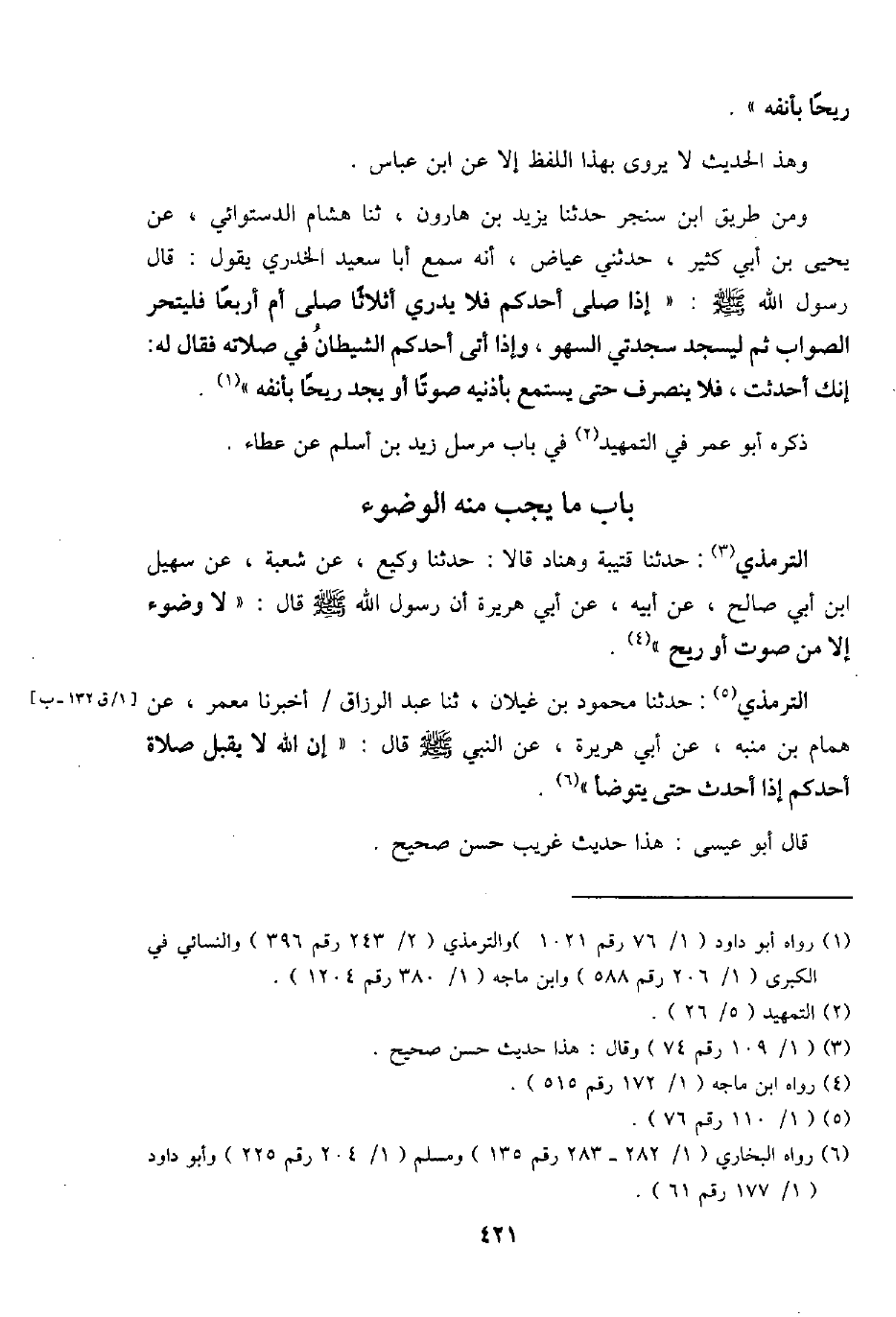 التِّرْمِذِيّ: حَدثنَا قُتَيْبَة وهناد قَالَا: حَدثنَا وَكِيع، عَن شُعْبَة، عَن سُهَيْل ابْن أبي صَالح، عَن أَبِيه، عَن أبي هُرَيْرَة أَن رَسُول الله - صَلَّى اللَّهُ عَلَيْهِ وَسَلَّم َ - قَالَ: " لَا وضوء إِلَّا من صَوت أَو ريح "