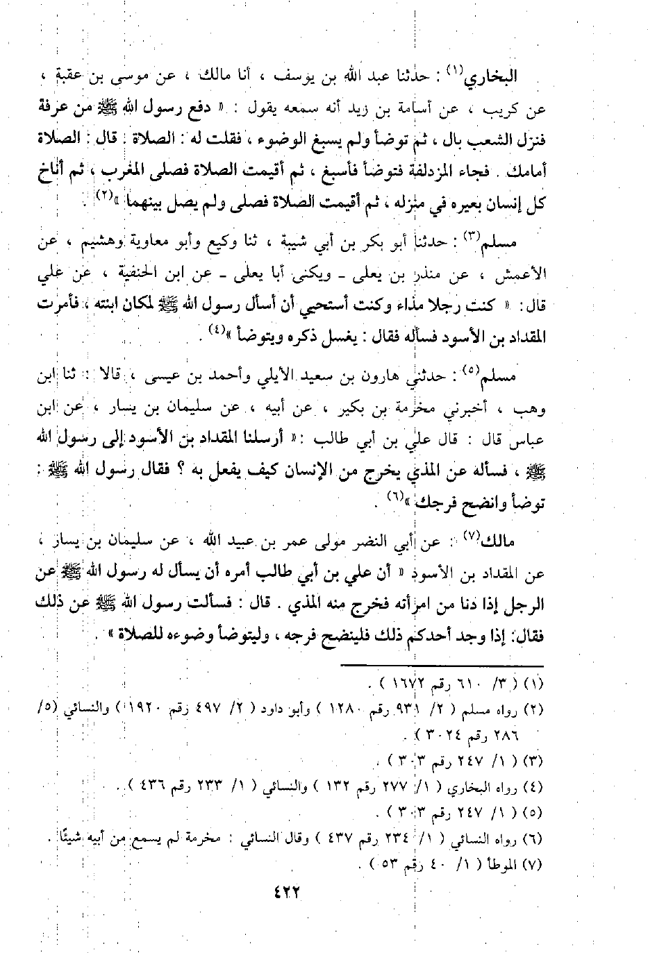 مَالك: عَن أبي النَّضر مولى عمر بن عبيد الله، عَن سُلَيْمَان بن يسَار، عَن الْمِقْدَاد بن الْأسود " أَن عَليّ بن أبي طَالب أمره أَن يسْأَل لَهُ رَسُول الله - صَلَّى اللَّهُ عَلَيْهِ وَسَلَّم َ - عَن الرجل إِذا دنا من امْرَأَته فَخرج مِنْهُ الْمَذْي. قَالَ: فَسَأَلت رَسُول الله - صَلَّى اللَّهُ عَلَيْهِ وَسَلَّم َ - عَن ذَلِك فَقَالَ: إِذا وجد أحدكُم ذَلِك فلينضح فرجه، وليتوضأ وضوءه للصَّلَاة ".