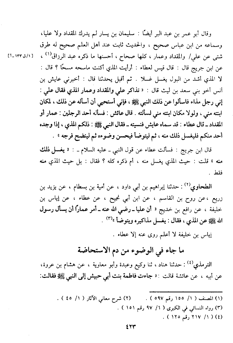 وَقَالَ أَبُو عمر بن عبد الْبر أَيْضا: سُلَيْمَان بن يسَار لم يدْرك الْمِقْدَاد وَلَا عليا، وسماعه من ابْن عَبَّاس صَحِيح، والْحَدِيث ثَابت عِنْد أهل الْعلم صَحِيح لَهُ طرق شَتَّى عَن عَليّ / والمقداد وعمار، كلهَا صِحَاح، أحْسنهَا مَا ذكره عبد الرَّزَّاق، عَن ابْن جريج قَالَ: قَالَ قيس لعطاء: أَرَأَيْت الْمَذْي أَكنت ماسحه مسحا؟ قَالَ: لَا الْمَذْي أَشد من الْبَوْل يغسل غسلا. ثمَّ أقبل يحدثنا قَالَ: أَخْبرنِي عايش بن أنس أَخُو بني سعد بن لَيْث قَالَ: " تَذَاكر عَليّ والمقداد وعمار الْمَذْي فَقَالَ عَليّ: إِنِّي رجل مذاء فاسألوا عَن ذَلِك النَّبِي - صَلَّى اللَّهُ عَلَيْهِ وَسَلَّم َ -، فَإِنِّي أستحيي أَن أسأله عَن ذَلِك، لمَكَان ابْنَته مني، وَلَوْلَا مَكَان ابْنَته مني لسألته. قَالَ عائش: فَسَأَلَهُ أحد الرجلَيْن: عمار أَو الْمِقْدَاد - قَالَ عَطاء: قد سَمَّاهُ عايش فَنسيته - فَقَالَ النَّبِي - صَلَّى اللَّهُ عَلَيْهِ وَسَلَّم َ -: ذَلِكُم الْمَذْي، إِذا وجده أحد مِنْكُم فليغسل ذَلِك مِنْهُ، ثمَّ ليتوضأ فَيحسن وضوءه ثمَّ لينضح فرجه ".