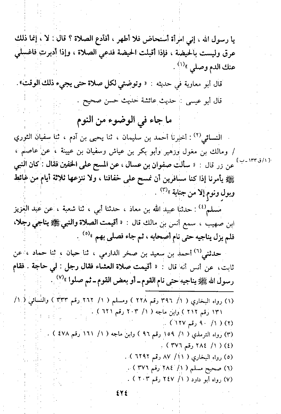 النَّسَائِيّ: أخبرنَا أَحْمد بن سُلَيْمَان، ثَنَا يحيى بن آدم، ثَنَا سُفْيَان الثَّوْريّ / وَمَالك بن مغول وَزُهَيْر وَأَبُو بكر بن عَيَّاش وسُفْيَان بن عُيَيْنَة، عَن عَاصِم، عَن زر قَالَ: " سَأَلت صَفْوَان بن عَسَّال، عَن الْمسْح على الْخُفَّيْنِ فَقَالَ: كَانَ النَّبِي - صَلَّى اللَّهُ عَلَيْهِ وَسَلَّم َ - يَأْمُرنَا إِذا كُنَّا مسافرين أَن نمسح على خفافنا، وَلَا ننزعها ثَلَاثَة أَيَّام من غَائِط وَبَوْل ونوم إِلَّا من جَنَابَة ".