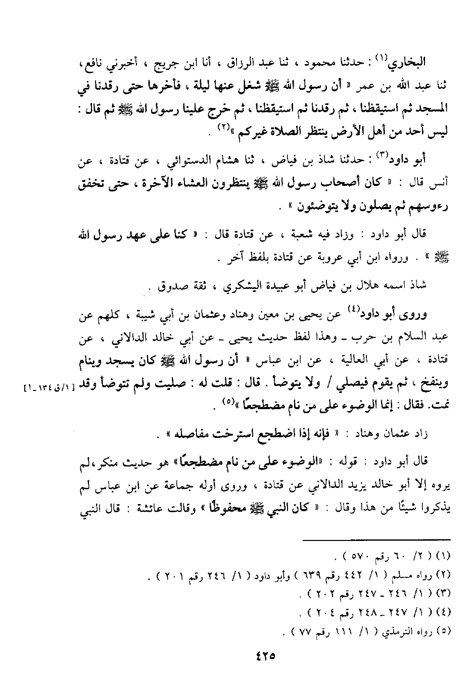 أَبُو دَاوُد: حَدثنَا شَاذ بن فياض، ثَنَا هِشَام الدستوَائي، عَن قَتَادَة، عَن أنس قَالَ: " كَانَ أَصْحَاب رَسُول الله - صَلَّى اللَّهُ عَلَيْهِ وَسَلَّم َ - ينتظرون الْعشَاء الْآخِرَة، حَتَّى تخفق رُءُوسهم ثمَّ يصلونَ وَلَا يَتَوَضَّئُونَ ".