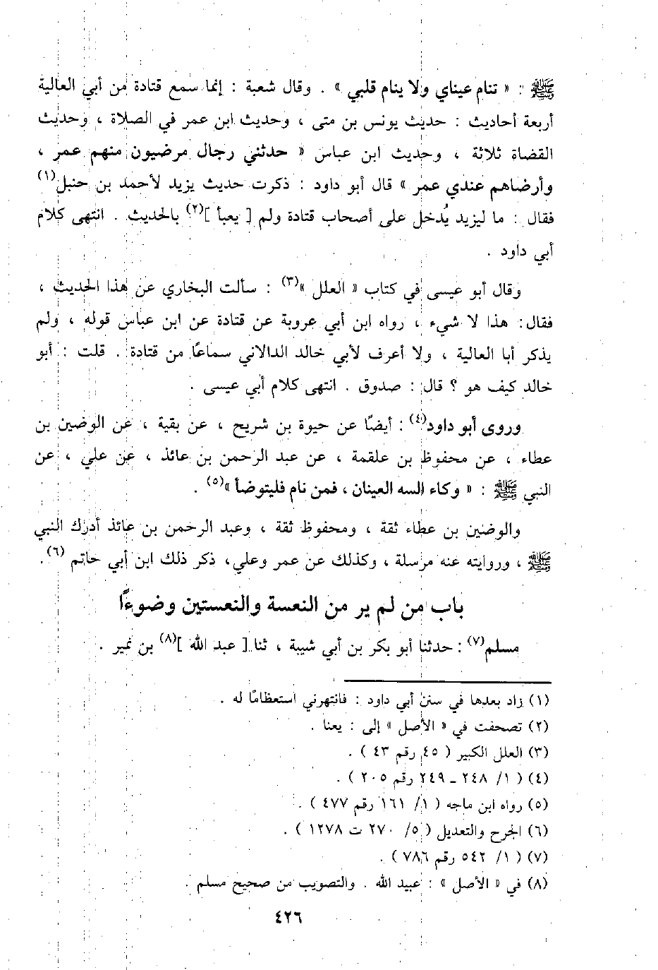 - صَلَّى اللَّهُ عَلَيْهِ وَسَلَّم َ -: " تنام عَيْنَايَ وَلَا ينَام قلبِي ". وَقَالَ شُعْبَة: إِنَّمَا سمع قَتَادَة من أبي الْعَالِيَة أَرْبَعَة أَحَادِيث: حَدِيث يُونُس بن مَتى، وَحَدِيث ابْن عمر فِي الصَّلَاة، وَحَدِيث الْقُضَاة ثَلَاثَة، وَحَدِيث ابْن عَبَّاس " حَدثنِي رجال مرضيون مِنْهُم عمر، وأرضاهم عِنْدِي عمر " قَالَ أَبُو دَاوُد: ذكرت حَدِيث يزِيد لِأَحْمَد بن حَنْبَل فَقَالَ: مَا ليزِيد يدْخل على أَصْحَاب قَتَادَة وَلم [يعبأ] بِالْحَدِيثِ. انْتهى كَلَام أبي دَاوُد.