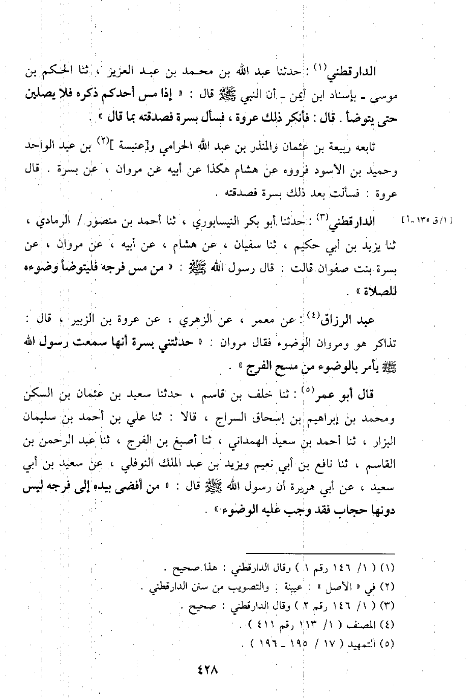 الدَّارَقُطْنِيّ: حَدثنَا عبد الله بن مُحَمَّد بن عبد الْعَزِيز، ثَنَا الحكم بن مُوسَى - بِإِسْنَاد ابْن أَيمن - أَن النَّبِي - صَلَّى اللَّهُ عَلَيْهِ وَسَلَّم َ - قَالَ: " إِذا مس أحدكُم ذكره فَلَا يصلين حَتَّى يتَوَضَّأ. قَالَ: فَأنْكر ذَلِك عُرْوَة، فَسَأَلَ بسرة فصدقته بِمَا قَالَ ".