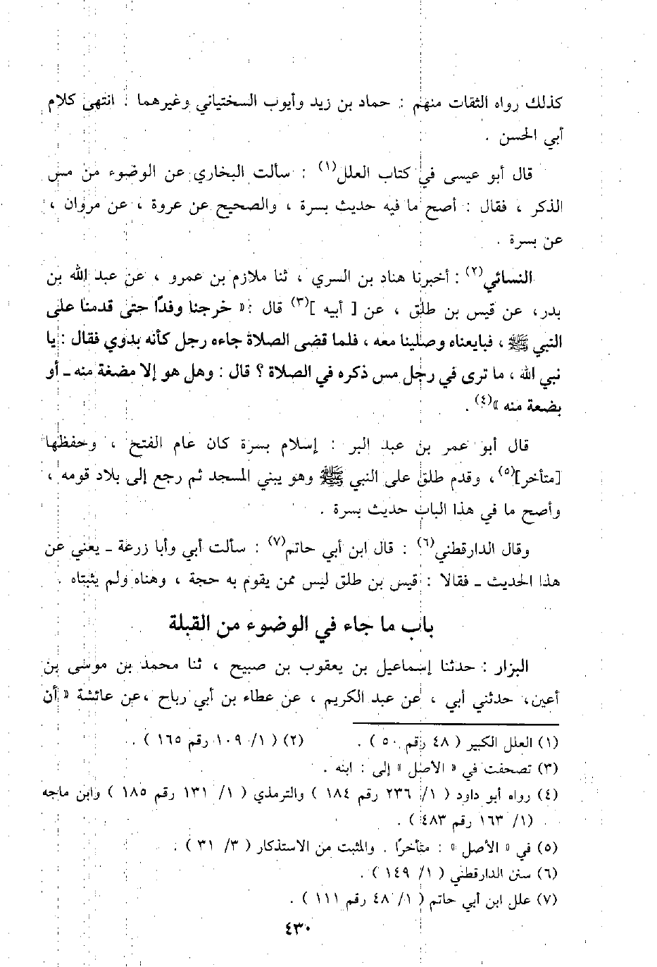 النَّسَائِيّ: أخبرنَا هناد بن السّري، ثَنَا ملازم بن عَمْرو، عَن عبد الله بن بدر، عَن قيس بن طلق، عَن [أَبِيه] قَالَ: " خرجنَا وَفْدًا حَتَّى قدمنَا على النَّبِي - صَلَّى اللَّهُ عَلَيْهِ وَسَلَّم َ -، فَبَايَعْنَاهُ وصلينا مَعَه، فَلَمَّا قضى الصَّلَاة جَاءَهُ رجل كَأَنَّهُ بدوي فَقَالَ: يَا نَبِي الله، مَا ترى فِي رجل مس ذكره فِي الصَّلَاة؟ قَالَ: وَهل هُوَ إِلَّا مُضْغَة مِنْهُ - أَو بضعَة مِنْهُ ".
