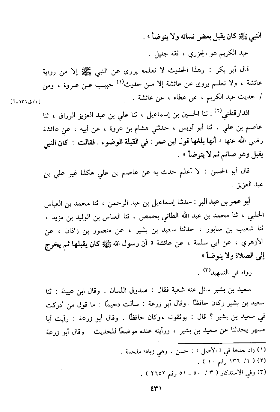 أَبُو عمر بن عبد الْبر: حَدثنَا إِسْمَاعِيل بن عبد الرَّحْمَن، ثَنَا مُحَمَّد بن الْعَبَّاس الْحلَبِي، ثَنَا مُحَمَّد بن عبد الله الطَّائِي بحمص، ثَنَا الْعَبَّاس بن الْوَلِيد بن مزِيد، ثَنَا شُعَيْب بن سَابُور، حَدثنَا سعيد بن بشير، عَن مَنْصُور بن زَاذَان، عَن الْأَزْهَرِي، عَن أبي سَلمَة، عَن عَائِشَة " أَن رَسُول الله - صَلَّى اللَّهُ عَلَيْهِ وَسَلَّم َ - كَانَ يقبلهَا ثمَّ يخرج إِلَى الصَّلَاة وَلَا يتَوَضَّأ ".