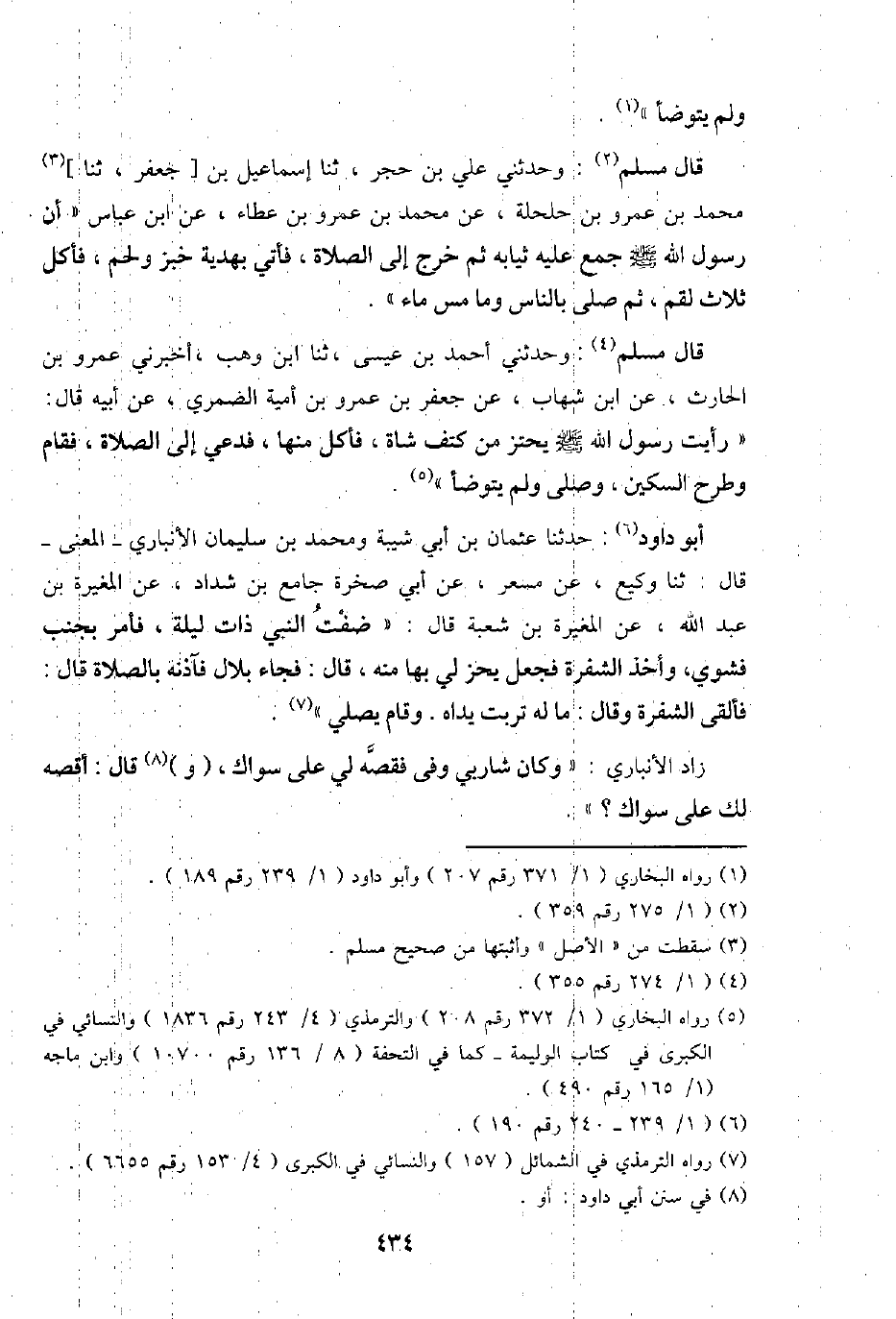 قَالَ مُسلم: وحَدثني أَحْمد بن عِيسَى، ثَنَا ابْن وهب، أَخْبرنِي عَمْرو بن الْحَارِث، عَن ابْن شهَاب، عَن جَعْفَر بن عَمْرو بن أُميَّة الضمرِي، عَن أَبِيه قَالَ: " رَأَيْت رَسُول الله - صَلَّى اللَّهُ عَلَيْهِ وَسَلَّم َ - يحتز من كتف شَاة، فَأكل مِنْهَا، فدعي إِلَى الصَّلَاة، فَقَامَ وَطرح السكين، وَصلى وَلم يتَوَضَّأ ".