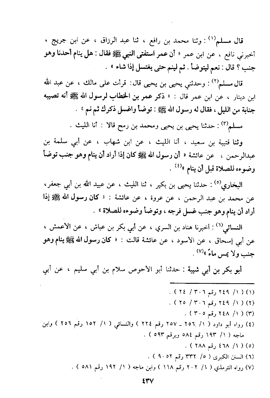 النَّسَائِيّ: أخبرنَا هناد بن السّري، عَن أبي بكر بن عَيَّاش، عَن الْأَعْمَش، عَن أبي إِسْحَاق، عَن الْأسود، عَن عَائِشَة قَالَت: " كَانَ رَسُول الله - صَلَّى اللَّهُ عَلَيْهِ وَسَلَّم َ - ينَام وَهُوَ جنب وَلَا يمس مَاء ".
