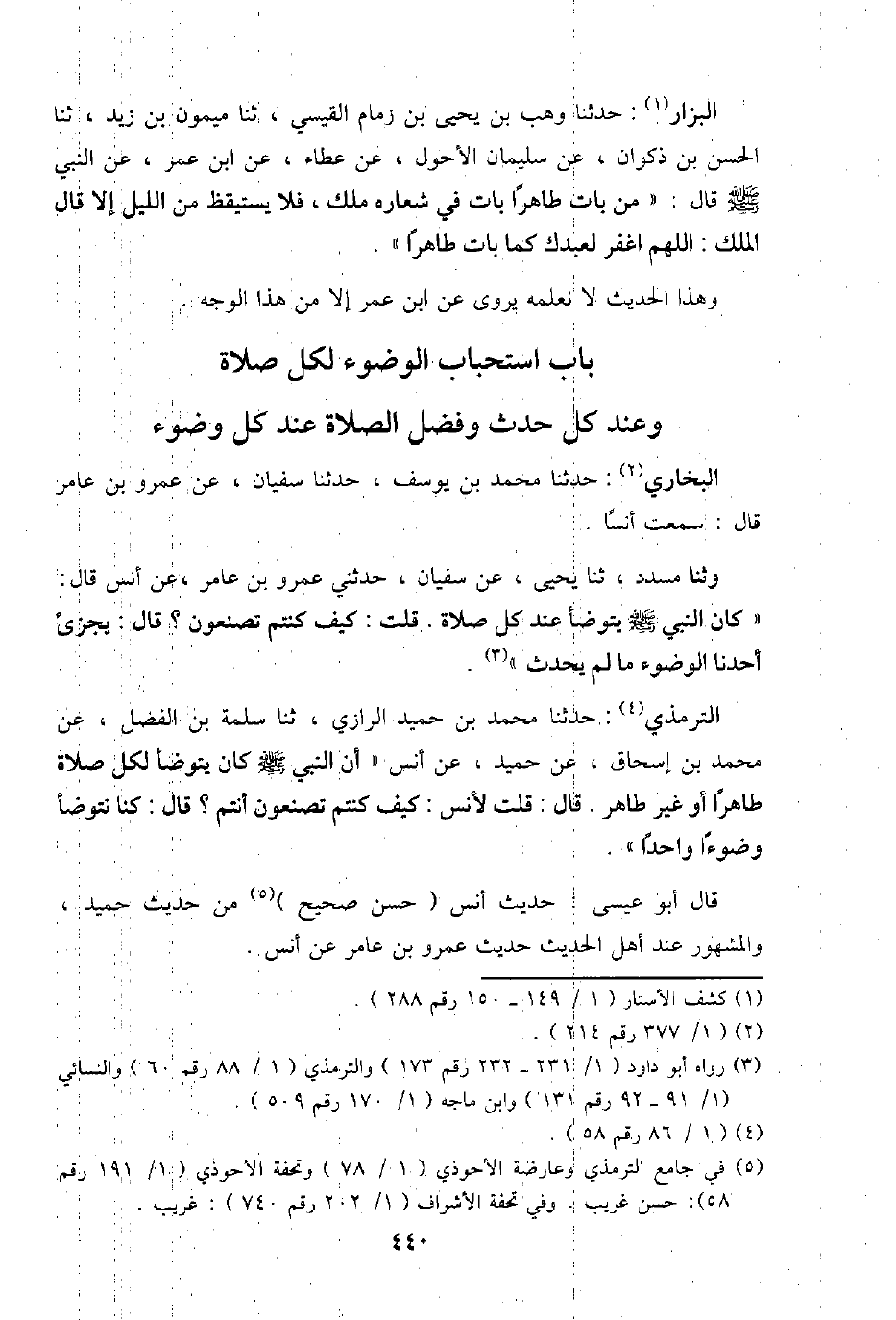 وثنا مُسَدّد، ثَنَا يحيى، عَن سُفْيَان، حَدثنِي عَمْرو بن عَامر، عَن أنس قَالَ: " كَانَ النَّبِي - صَلَّى اللَّهُ عَلَيْهِ وَسَلَّم َ - يتَوَضَّأ عِنْد كل صَلَاة. قلت: كَيفَ كُنْتُم تَصْنَعُونَ؟ قَالَ: يُجزئ أَحَدنَا الْوضُوء مَا لم يحدث ".