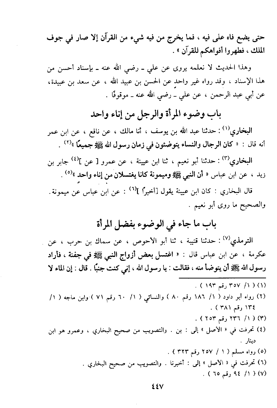 البُخَارِيّ: حَدثنَا عبد الله بن يُوسُف، أَنا مَالك، عَن نَافِع، عَن ابْن عمر أَنه قَالَ: " كَانَ الرِّجَال وَالنِّسَاء يَتَوَضَّئُونَ فِي زمَان رَسُول الله - صَلَّى اللَّهُ عَلَيْهِ وَسَلَّم َ - جَمِيعًا ".