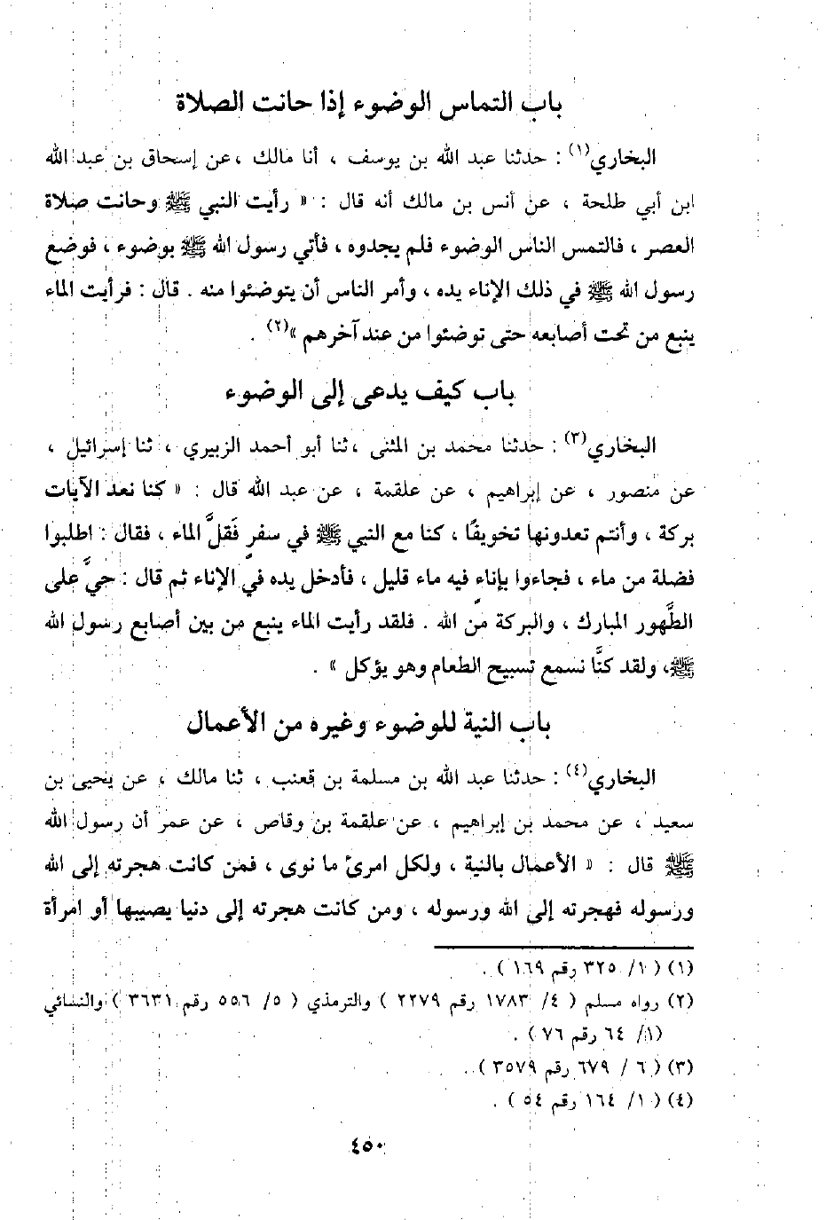 البُخَارِيّ: حَدثنَا عبد الله بن يُوسُف، أَنا مَالك، عَن إِسْحَاق بن عبد الله ابْن أبي طَلْحَة، عَن أنس بن مَالك أَنه قَالَ: " رَأَيْت النَّبِي - صَلَّى اللَّهُ عَلَيْهِ وَسَلَّم َ - وحانت صَلَاة الْعَصْر، فالتمس النَّاس الْوضُوء فَلم يجدوه، فَأتي رَسُول الله - صَلَّى اللَّهُ عَلَيْهِ وَسَلَّم َ - بِوضُوء، فَوضع رَسُول الله - صَلَّى اللَّهُ عَلَيْهِ وَسَلَّم َ - فِي ذَلِك الْإِنَاء يَده، وَأمر النَّاس أَن يتوضئوا مِنْهُ. قَالَ: فَرَأَيْت المَاء يَنْبع من تَحت أَصَابِعه حَتَّى توضئوا من عِنْد آخِرهم ".