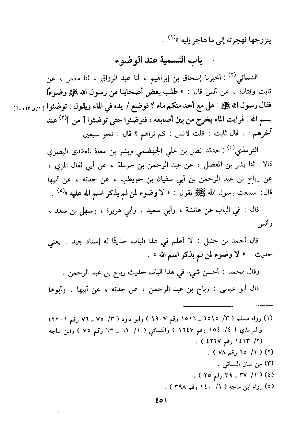 التِّرْمِذِيّ: حَدثنَا نصر بن عَليّ الْجَهْضَمِي وَبشر بن معَاذ الْعَقدي الْبَصْرِيّ قَالَا: ثَنَا بشر بن الْمفضل، عَن عبد الرَّحْمَن بن حَرْمَلَة، عَن أبي ثفال المري، عَن رَبَاح بن عبد الرَّحْمَن بن أبي سُفْيَان بن حويطب، عَن جدته، عَن أَبِيهَا قَالَ: سَمِعت رَسُول الله - صَلَّى اللَّهُ عَلَيْهِ وَسَلَّم َ - يَقُول: " لَا وضوء لمن لم يذكر اسْم الله عَلَيْهِ ".