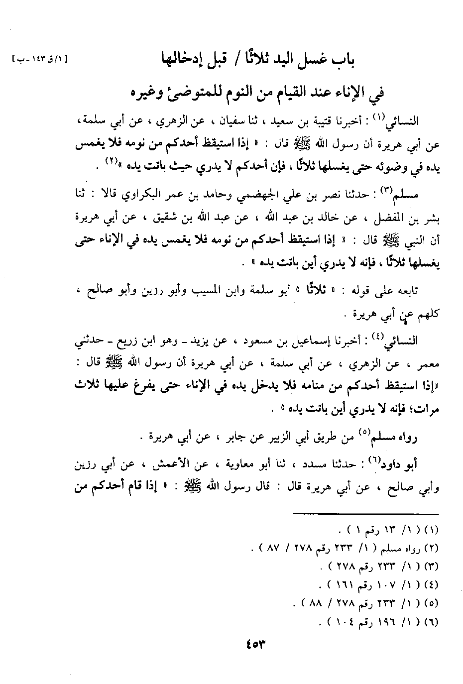 مُسلم: حَدثنَا نصر بن عَليّ الْجَهْضَمِي وحامد بن عمر البكراوي قَالَا: ثَنَا بشر بن الْمفضل، عَن خَالِد بن عبد الله، عَن عبد الله بن شَقِيق، عَن أبي هُرَيْرَة أَن النَّبِي - صَلَّى اللَّهُ عَلَيْهِ وَسَلَّم َ - قَالَ: " إِذا اسْتَيْقَظَ أحدكُم من نَومه فَلَا يغمس يَده فِي الْإِنَاء حَتَّى يغسلهَا ثَلَاثًا، فَإِنَّهُ لَا يدْرِي أَيْن باتت يَده ".