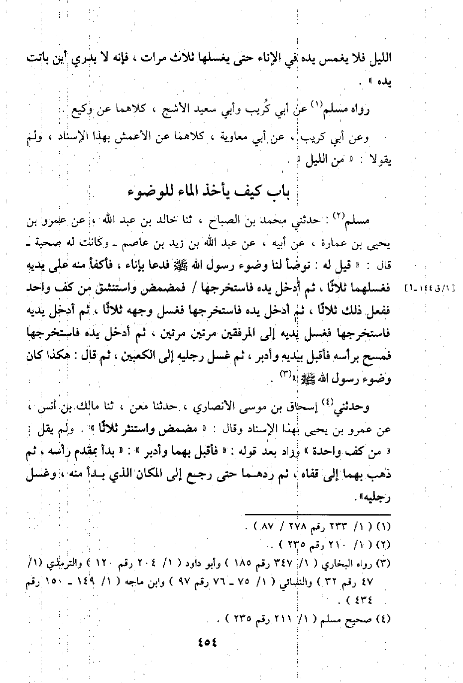 مُسلم: حَدثنِي مُحَمَّد بن الصَّباح، ثَنَا خَالِد بن عبد الله، عَن عَمْرو بن يحيى بن عمَارَة، عَن أَبِيه، عَن عبد الله بن زيد بن عَاصِم - وَكَانَت لَهُ صُحْبَة - قَالَ: " قيل لَهُ: تَوَضَّأ لنا وضوء رَسُول الله - صَلَّى اللَّهُ عَلَيْهِ وَسَلَّم َ - فَدَعَا بِإِنَاء، فأكفأ مِنْهُ على يَدَيْهِ فغسلهما ثَلَاثًا، ثمَّ أَدخل يَده فاستخرجها / فَمَضْمض واستنشق من كف وَاحِد فَفعل ذَلِك ثَلَاثًا، ثمَّ أَدخل يَده فاستخرجها فَغسل وَجهه ثَلَاثًا، ثمَّ أَدخل يَدَيْهِ فاستخرجها فَغسل يَدَيْهِ إِلَى الْمرْفقين مرَّتَيْنِ مرَّتَيْنِ، ثمَّ أَدخل يَده فاستخرجها فَمسح بِرَأْسِهِ فَأقبل بيدَيْهِ وَأدبر، ثمَّ غسل رجلَيْهِ إِلَى الْكَعْبَيْنِ، ثمَّ قَالَ: هَكَذَا كَانَ وضوء رَسُول الله - صَلَّى اللَّهُ عَلَيْهِ وَسَلَّم َ - ".