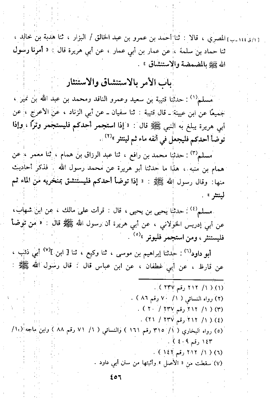 مُسلم: حَدثنَا قُتَيْبَة بن سعيد وَعَمْرو النَّاقِد وَمُحَمّد بن عبد الله بن نمير، جَمِيعًا عَن ابْن عُيَيْنَة - قَالَ قُتَيْبَة: ثَنَا سُفْيَان - عَن أبي الزِّنَاد، عَن الْأَعْرَج، عَن أبي هُرَيْرَة يبلغ بِهِ النَّبِي - صَلَّى اللَّهُ عَلَيْهِ وَسَلَّم َ - قَالَ: " إِذا استجمر أحدكُم فليستجمر وترا، وَإِذا تَوَضَّأ أحدكُم فليجعل فِي أَنفه مَاء ثمَّ لينتثر ".