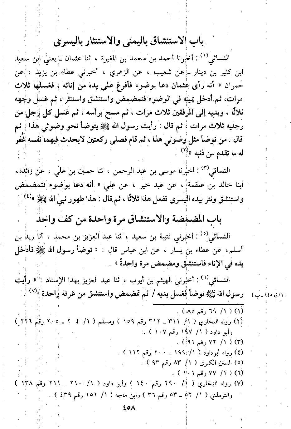 النَّسَائِيّ: أخبرنَا مُوسَى بن عبد الرَّحْمَن، ثَنَا حُسَيْن بن عَليّ، عَن زَائِدَة، ابْنا خَالِد بن عَلْقَمَة، عَن عبد خير، عَن عَليّ " أَنه دَعَا بِوضُوء فَتَمَضْمَض واستنشق ونثر بِيَدِهِ الْيُسْرَى فَفعل هَذَا ثَلَاثًا، ثمَّ قَالَ: هَذَا طهُور نَبِي الله - صَلَّى اللَّهُ عَلَيْهِ وَسَلَّم َ - ".