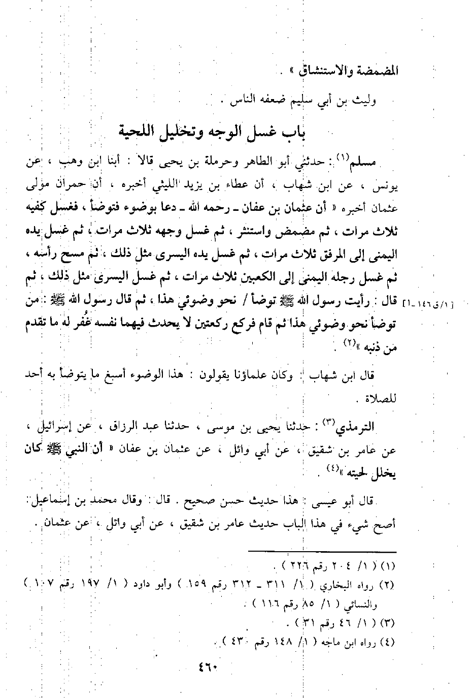 مُسلم: حَدثنِي أَبُو الطَّاهِر وحرملة بن يحيى قَالَا: أبنا ابْن وهب، عَن يُونُس، عَن ابْن شهَاب، أَن عَطاء بن يزِيد اللَّيْثِيّ أخبرهُ، أَن حمْرَان مولى عُثْمَان أخبرهُ " أَن عُثْمَان بن عَفَّان - رَحمَه الله - دَعَا بِوضُوء فَتَوَضَّأ، فَغسل كفيه ثَلَاث مَرَّات، ثمَّ مضمض واستنثر، ثمَّ غسل وَجهه ثَلَاث مَرَّات، ثمَّ غسل يَده الْيُمْنَى إِلَى الْمرْفق ثَلَاث مَرَّات، ثمَّ غسل يَده الْيُسْرَى مثل ذَلِك، ثمَّ مسح رَأسه، ثمَّ غسل رجله الْيُمْنَى إِلَى الْكَعْبَيْنِ ثَلَاث مَرَّات، ثمَّ غسل الْيُسْرَى مثل ذَلِك، ثمَّ قَالَ: رَأَيْت رَسُول الله - صَلَّى اللَّهُ عَلَيْهِ وَسَلَّم َ - تَوَضَّأ / نَحْو وضوئي هَذَا، ثمَّ قَالَ رَسُول الله - صَلَّى اللَّهُ عَلَيْهِ وَسَلَّم َ -: من تَوَضَّأ نَحْو وضوئي هَذَا ثمَّ قَامَ فَرَكَعَ رَكْعَتَيْنِ لَا يحدث فيهمَا نَفسه غفر لَهُ مَا تقدم من ذَنبه ".