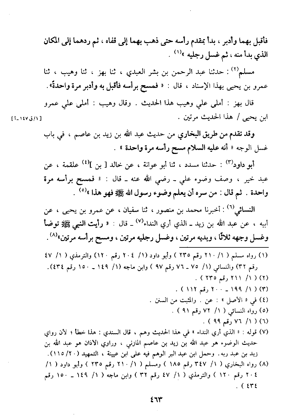 مُسلم: حَدثنَا عبد الرَّحْمَن بن بشر الْعَبْدي، ثَنَا بهز، ثَنَا وهيب، ثَنَا عَمْرو بن يحيى بِهَذَا الْإِسْنَاد، قَالَ: " فَمسح بِرَأْسِهِ فَأقبل بِهِ وَأدبر مرّة وَاحِدَة ".