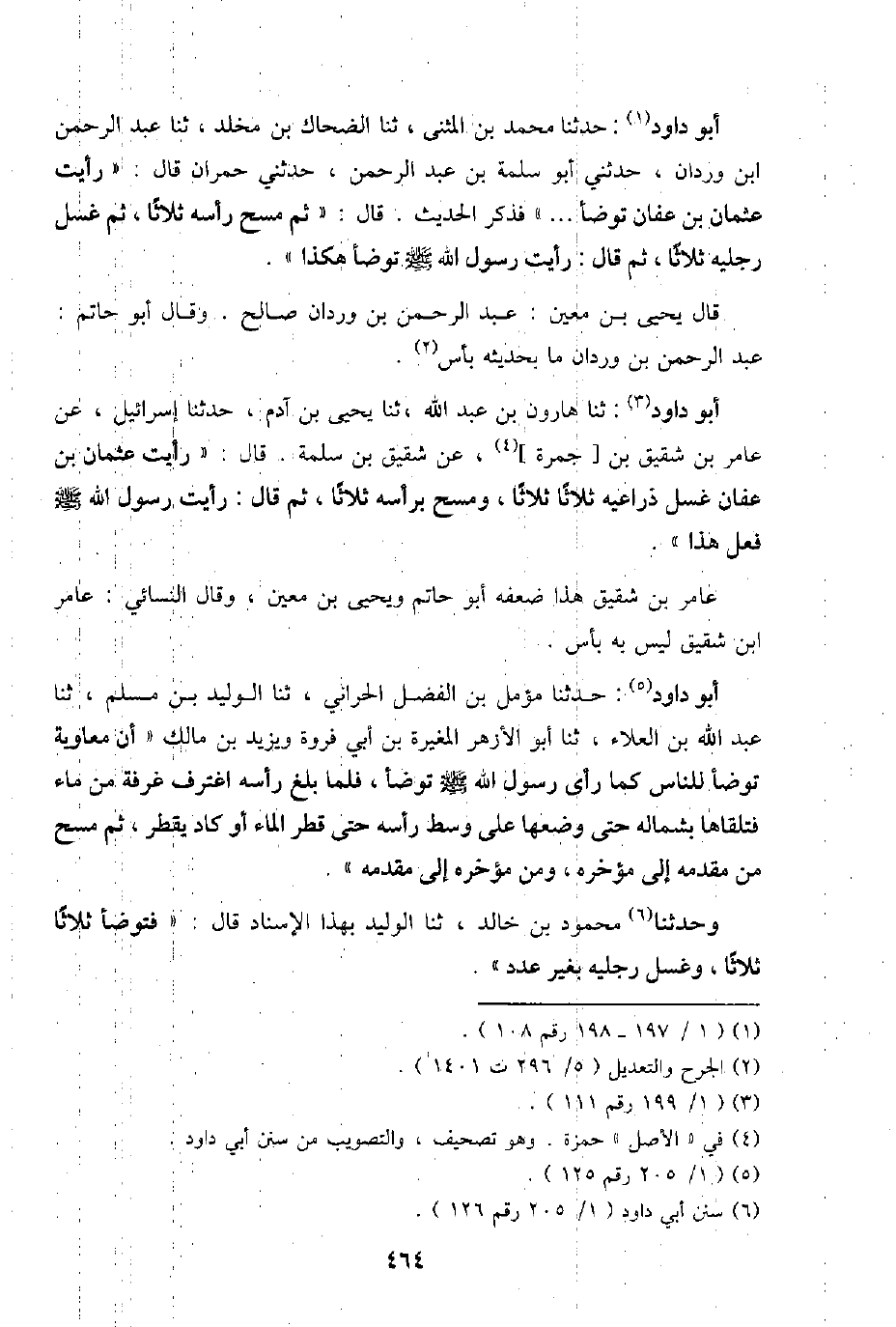 أَبُو دَاوُد: حَدثنَا مُحَمَّد بن الْمثنى، ثَنَا الضَّحَّاك بن مخلد، ثَنَا عبد الرَّحْمَن ابْن وردان، حَدثنِي أَبُو سَلمَة بن عبد الرَّحْمَن، حَدثنِي حمْرَان قَالَ: " رَأَيْت عُثْمَان بن عَفَّان تَوَضَّأ ... " فَذكر الحَدِيث. قَالَ: " ثمَّ مسح رَأسه ثَلَاثًا، ثمَّ غسل رجلَيْهِ ثَلَاثًا، ثمَّ قَالَ: رَأَيْت رَسُول الله - صَلَّى اللَّهُ عَلَيْهِ وَسَلَّم َ - تَوَضَّأ هَكَذَا ".