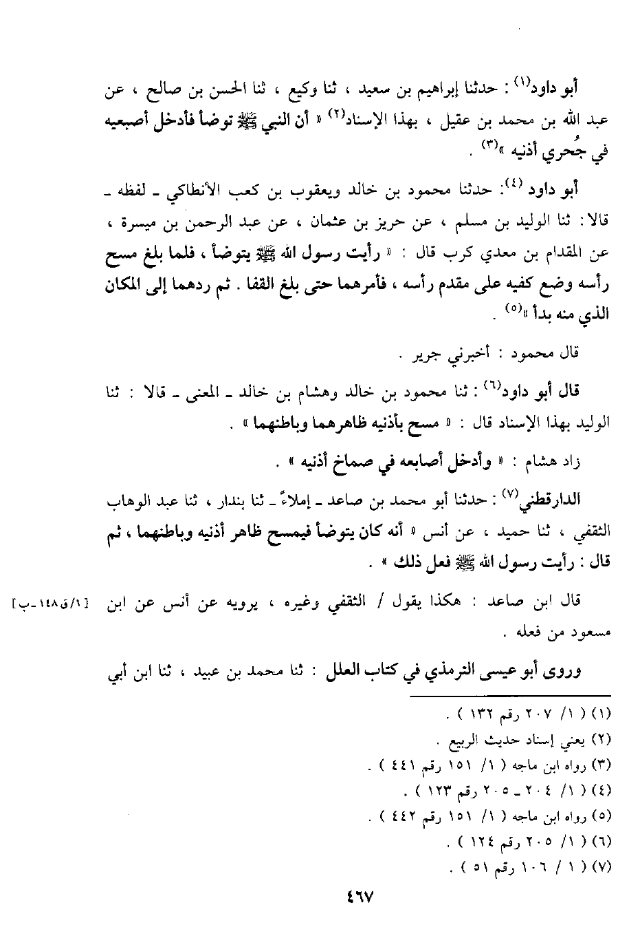 أَبُو دَاوُد: حَدثنَا مَحْمُود بن خَالِد وَيَعْقُوب بن كَعْب الْأَنْطَاكِي - لَفظه - قَالَا: ثَنَا الْوَلِيد بن مُسلم، عَن حريز بن عُثْمَان، عَن عبد الرَّحْمَن بن ميسرَة، عَن الْمِقْدَام بن معدي كرب قَالَ: " رَأَيْت رَسُول الله - صَلَّى اللَّهُ عَلَيْهِ وَسَلَّم َ - يتَوَضَّأ، فَلَمَّا بلغ مسح رَأسه وضع كفيه على مقدم رَأسه، فَأَمرهمَا حَتَّى بلغ الْقَفَا. ثمَّ ردهما إِلَى الْمَكَان الَّذِي مِنْهُ بَدَأَ ".