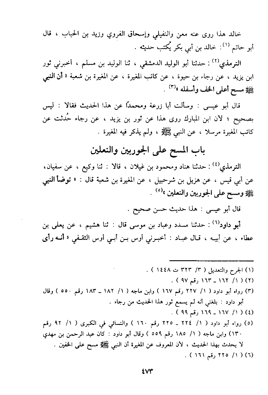 التِّرْمِذِيّ: حَدثنَا هناد ومحمود بن غيلَان، قَالَا: ثَنَا وَكِيع، عَن سُفْيَان، عَن أبي قيس، عَن هزيل بن شُرَحْبِيل، عَن الْمُغيرَة بن شُعْبَة قَالَ: " تَوَضَّأ النَّبِي - صَلَّى اللَّهُ عَلَيْهِ وَسَلَّم َ - وَمسح على الجوربين والنعلين ".