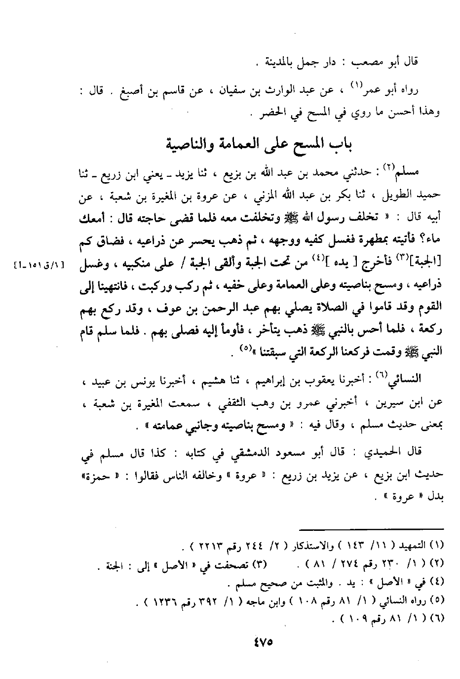 مُسلم: حَدثنِي مُحَمَّد بن عبد الله بن بزيع، ثَنَا يزِيد - يَعْنِي ابْن زُرَيْع - ثَنَا حميد الطَّوِيل، ثَنَا بكر بن عبد الله الْمُزنِيّ، عَن عُرْوَة بن الْمُغيرَة بن شُعْبَة، عَن أَبِيه قَالَ: " تخلف رَسُول الله - صَلَّى اللَّهُ عَلَيْهِ وَسَلَّم َ - وَتَخَلَّفت مَعَه فَلَمَّا قضى حَاجته قَالَ: أَمَعَك مَاء؟ فَأَتَيْته بمطهرة فَغسل كفيه وَوَجهه، ثمَّ ذهب يحسر عَن ذِرَاعَيْهِ، فَضَاقَ كم [الْجُبَّة] فَأخْرج [يَده] من تَحت الْجُبَّة وَألقى الْجُبَّة / على مَنْكِبَيْه، وَغسل ذِرَاعَيْهِ، وَمسح بناصيته وعَلى الْعِمَامَة وعَلى خفيه، ثمَّ ركب وَركبت، فَانْتَهَيْنَا إِلَى الْقَوْم وَقد قَامُوا فِي الصَّلَاة يُصَلِّي بهم عبد الرَّحْمَن بن عَوْف، وَقد ركع بهم رَكْعَة، فَلَمَّا أحس بِالنَّبِيِّ - صَلَّى اللَّهُ عَلَيْهِ وَسَلَّم َ - ذهب يتَأَخَّر، فَأَوْمأ إِلَيْهِ فصلى بهم. فَلَمَّا سلم قَامَ النَّبِي - صَلَّى اللَّهُ عَلَيْهِ وَسَلَّم َ - وَقمت فَرَكَعْنَا الرَّكْعَة الَّتِي سبقتنا ".